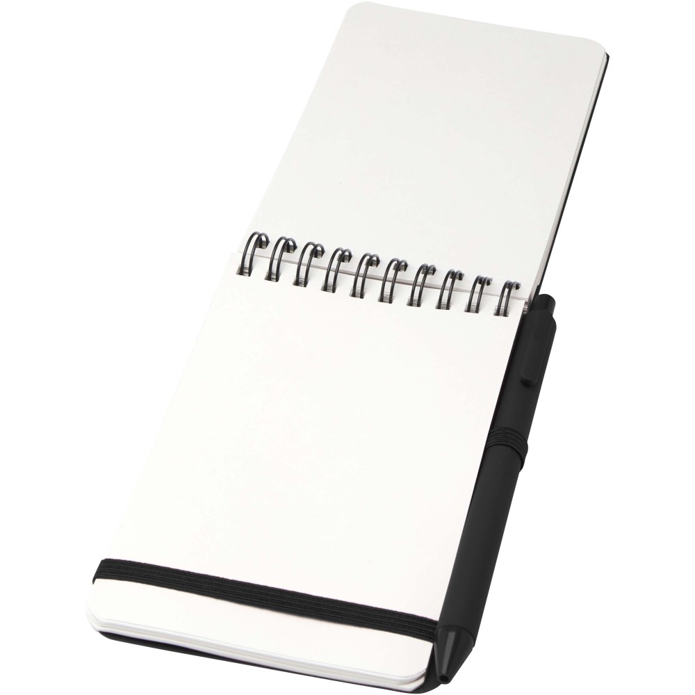 Thalaasa A6 keményfedeles jegyzetfüzet óceánból származó újrahasznosított műanyagból készült, és 80 vonalas, 70 g/m2 krémszínű lapot tartalmaz. A jegyzetfüzet lekerekített sarkokkal, elasztikus zárással és tolltartóval rendelkezik. A fekete tintával író golyóstoll szintén óceánból származó újrahasznosított műanyagból készült. Íráshossz: 1000 méter. Tollhegy mérete: 1,0 mm. Emblémázás: Tamponnyomás