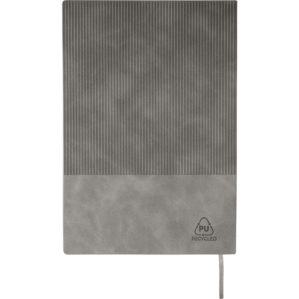 Újrahasznosított PU jegyzetfüzet, kb. A5-ös méretű, 100 lapos. Kemény borítóval és kordbársony hatású bevonattal az elülső és a hátlap felső részén. Tartalmaz egy szalagos könyvjelzőt és 80 g/m2-es vonalas lapokat. A hátoldalon dombornyomott újrahasznosított logóval. Emblémázás: Szitanyomás