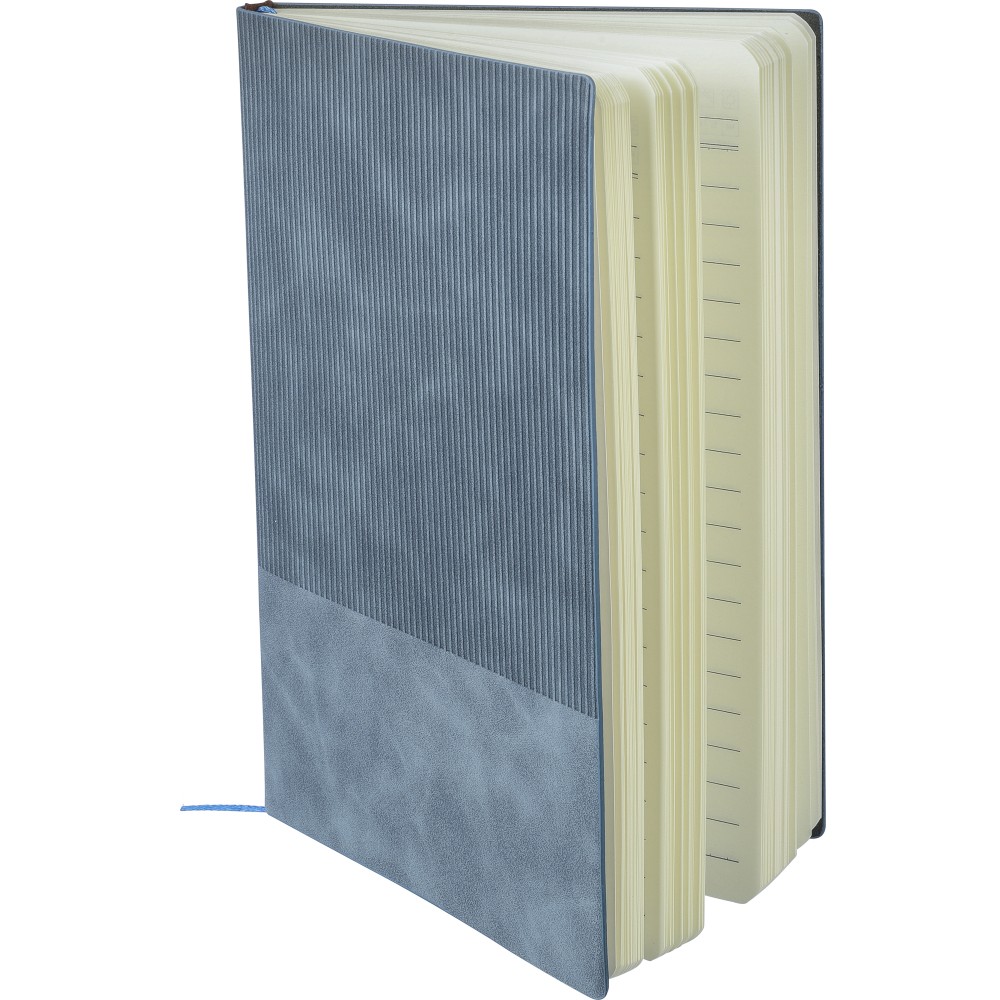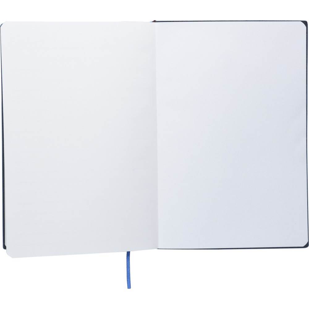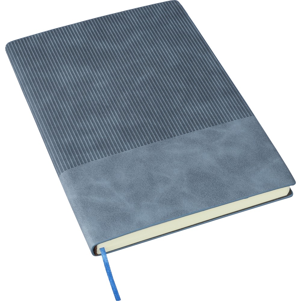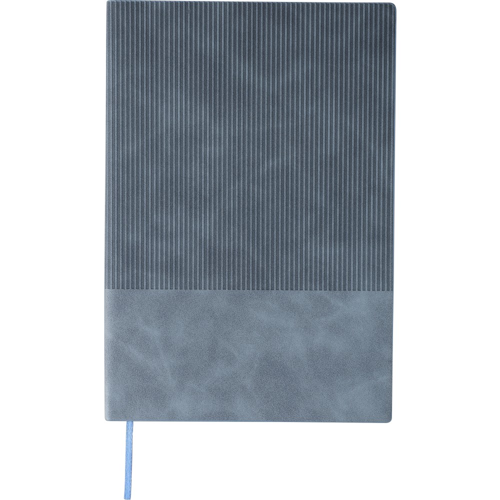 Újrahasznosított PU jegyzetfüzet, kb. A5-ös méretű, 100 lapos. Kemény borítóval és kordbársony hatású bevonattal az elülső és a hátlap felső részén. Tartalmaz egy szalagos könyvjelzőt és 80 g/m2-es vonalas lapokat. A hátoldalon dombornyomott újrahasznosított logóval. Emblémázás: Szitanyomás