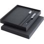 A Legato szett egy elegáns kombinációja egy A5 jegyzetfüzetnek és egy rollerball tollnak. A toll felső része RCS tanúsítvánnyal rendelkező, újrahasznosított rézből készült ezüst krómozott felülettel, alsó része színezett bevonattal rendelkezik, fém ezüst krómozott kiegészítőkkel és LUXE logóval a középső gyűrűn. Tinta színe: kék. Íráshossz: 400 méter. Hegyméret: 0,7 mm. Plusz fekete betét is tartozik hozzá. A jegyzetfüzet 80 lap 80 g/m2 vonalas, krémszínű papírt tartalmaz, újrahasznosított bőrszerű műanyag borítóval, gumis záródással, szalagos könyvjelzővel és harmonika zsebbel. A gumipánton ezüst krómozott fém dísz található. Karton díszdobozban kerül átadásra. Emblémázás: Gravírozás, Tamponnyomás