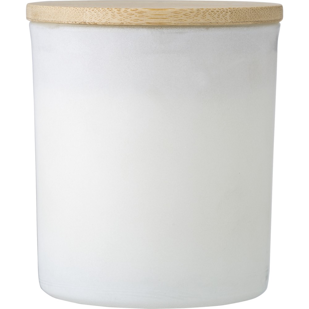 Üveggyertya növényi alapú viasszal és bambusz fedővel. A gyertya főleg növényi viaszt (karnaubaviaszt) tartalmaz, égési ideje körülbelül 33 óra. Négy illat az üveg színétől függően: fahéj (piros), vanília (fehér), szantálfa (fekete) és jázmin (zöld). Egyenként, fehér papírpalástba csomagolva. Emblémázás: Gravírozás, Tamponnyomás, UV nyomtatás