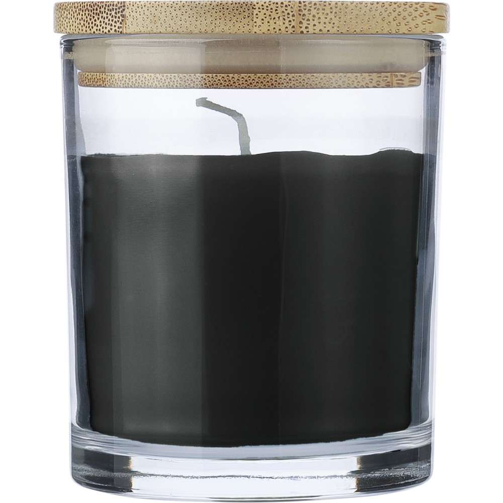 Üveg gyertyatartó 120 g vanília illatú, színes viasszal és bambusz fedéllel. Kb. 20 óra égési idővel. Csomagolása fehér papírhenger. Emblémázás: Gravírozás, Tamponnyomás