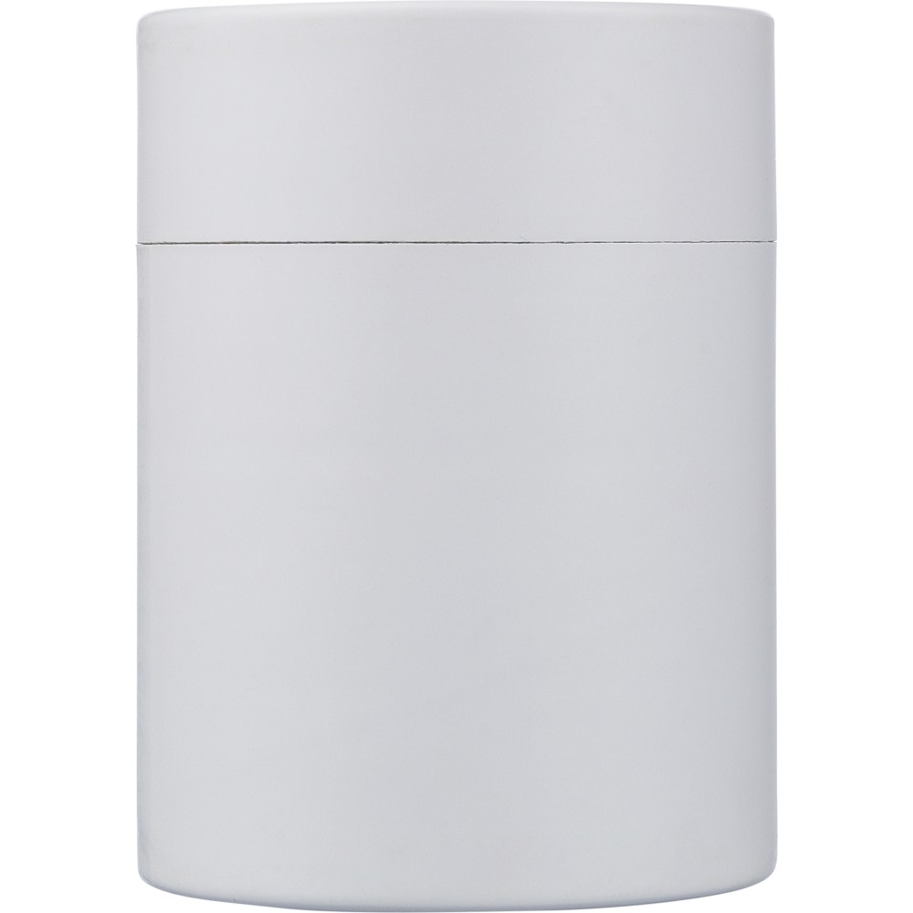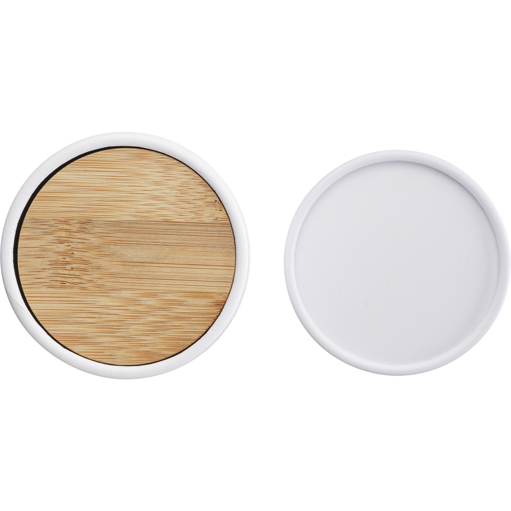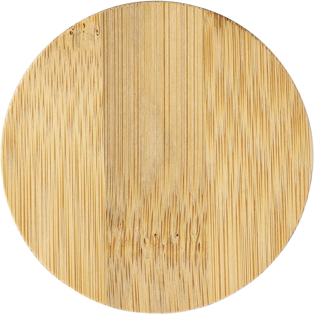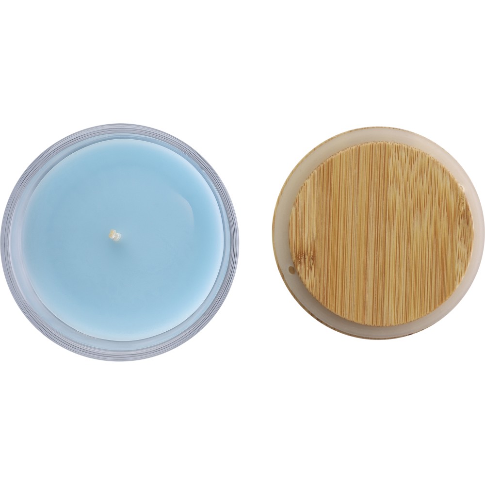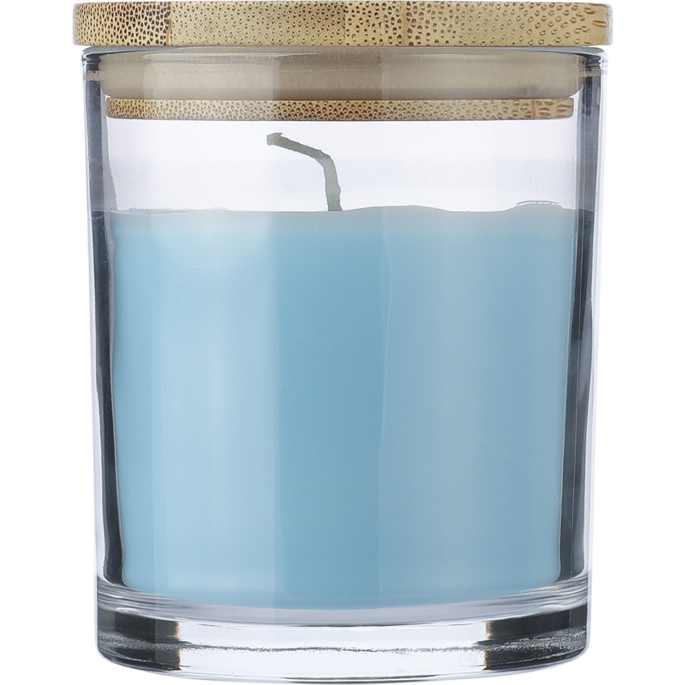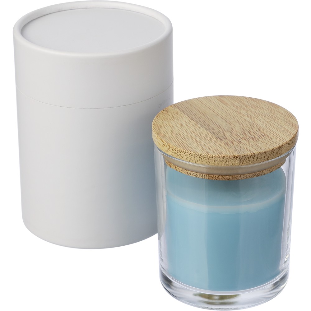 Üveg gyertyatartó 120 g vanília illatú, színes viasszal és bambusz fedéllel. Kb. 20 óra égési idővel. Csomagolása fehér papírhenger. Emblémázás: Gravírozás, Tamponnyomás