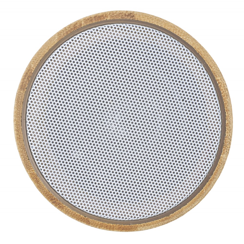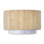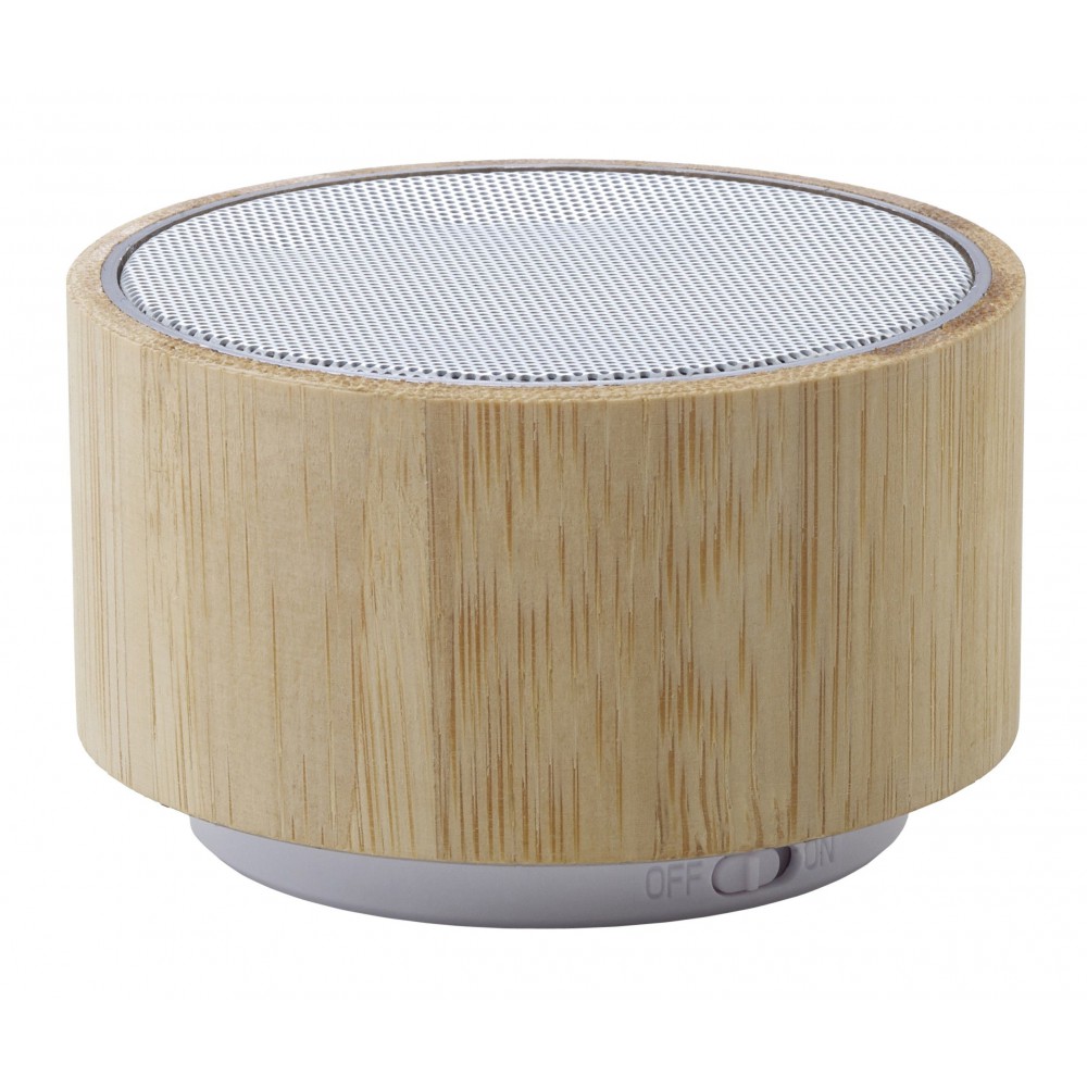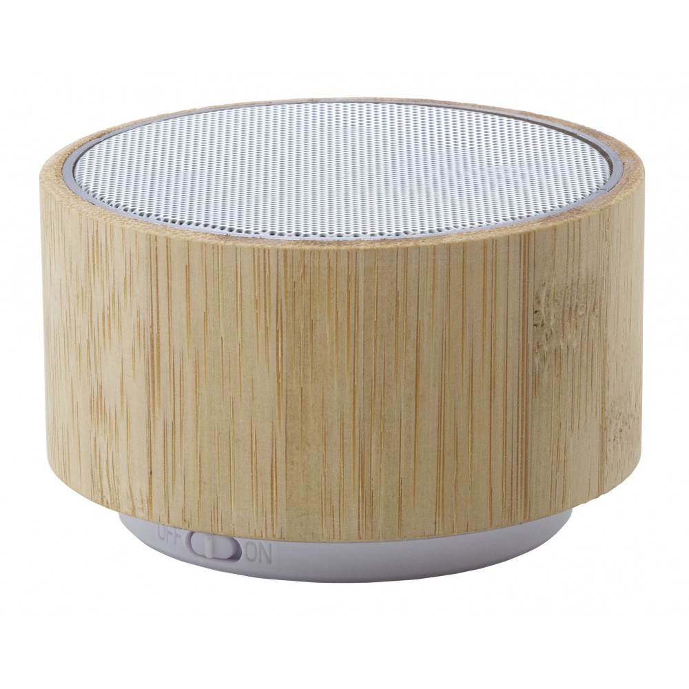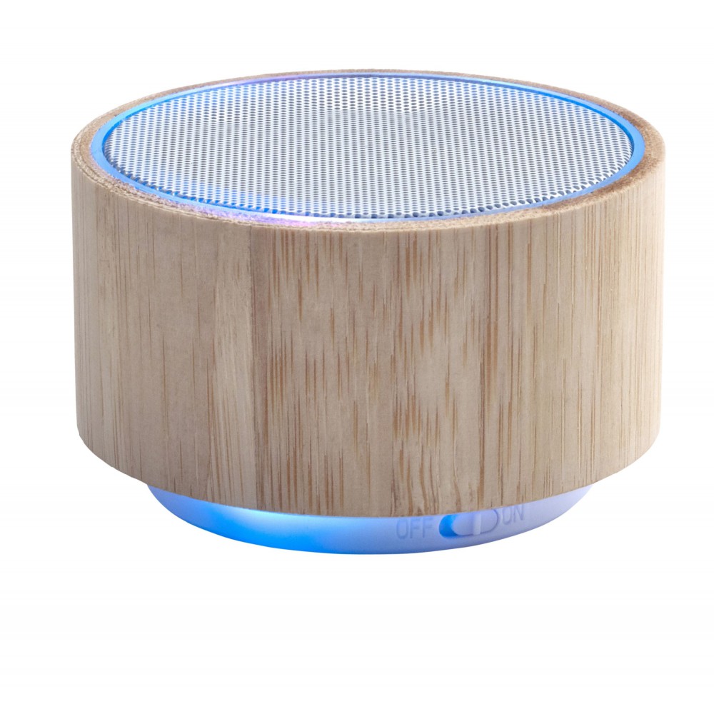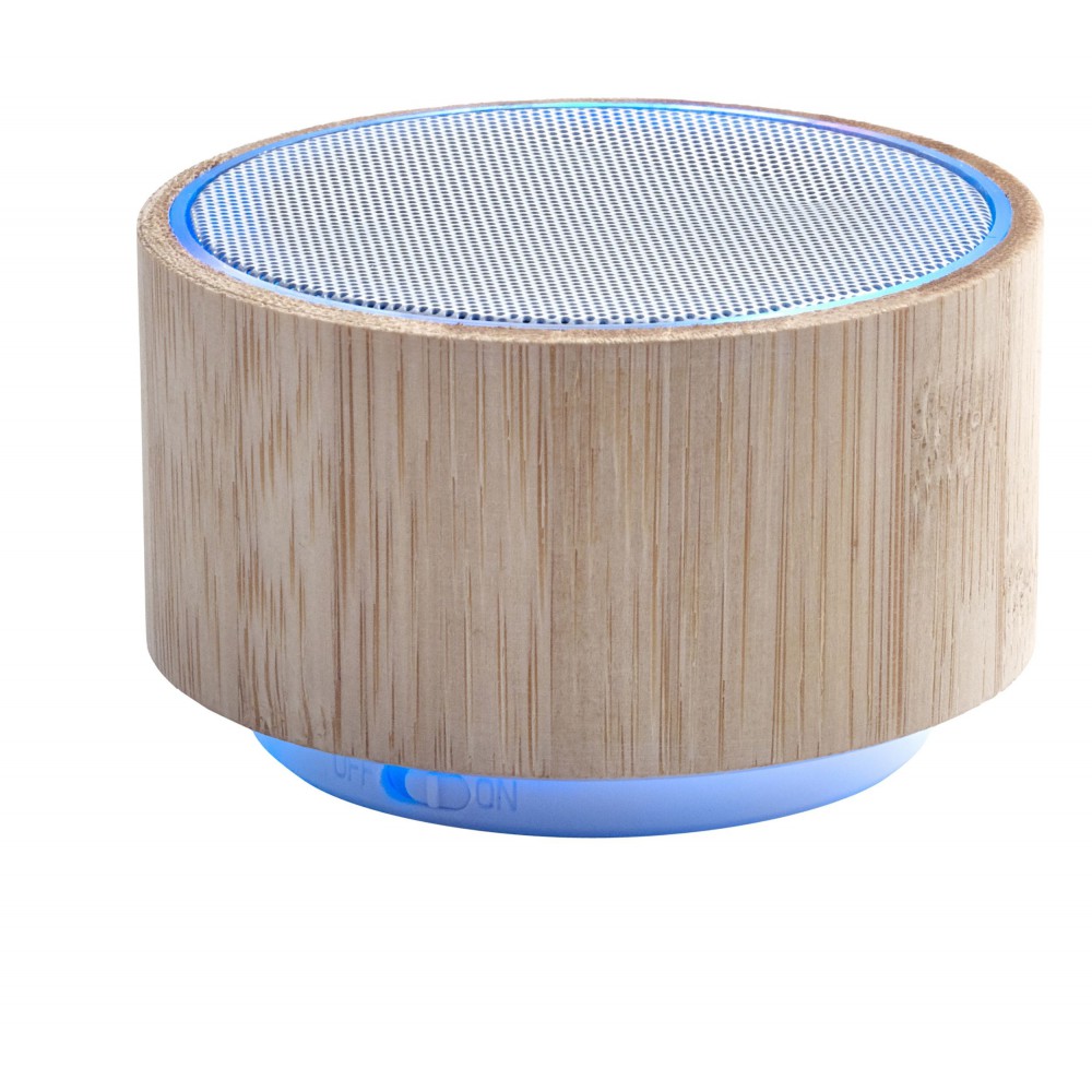 Vezeték nélküli hangszóró változó fénnyel, 3W teljesítménnyel, tölthető, 3 mAh-es li-ion akkumulátorral. Játszási idő egy töltéssel kb. 3 óra. A vezetéket tartalmazza. Csomagolása fehér doboz. Bambusz. Emblémázás: Gravírozás, Tamponnyomás, UV nyomtatás