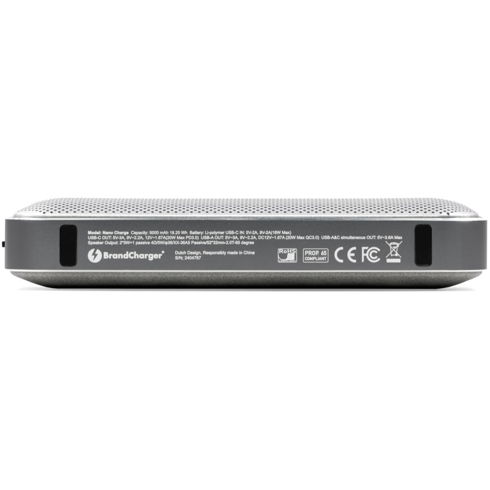 BrandCharger kompakt vezeték nélküli hangszóró és 5.000 mAh-s powerbank 10W-os Ambient Harmonics™ rendszerű hangszóróval. 20W-ig támogatja a gyorstöltést (PD3.0/QC3.0). Alumínium szünet-, lejátszás- és hangerőgombokkal. Bluetooth és usb-c kompatibilis. Emblémázás: Gravírozás