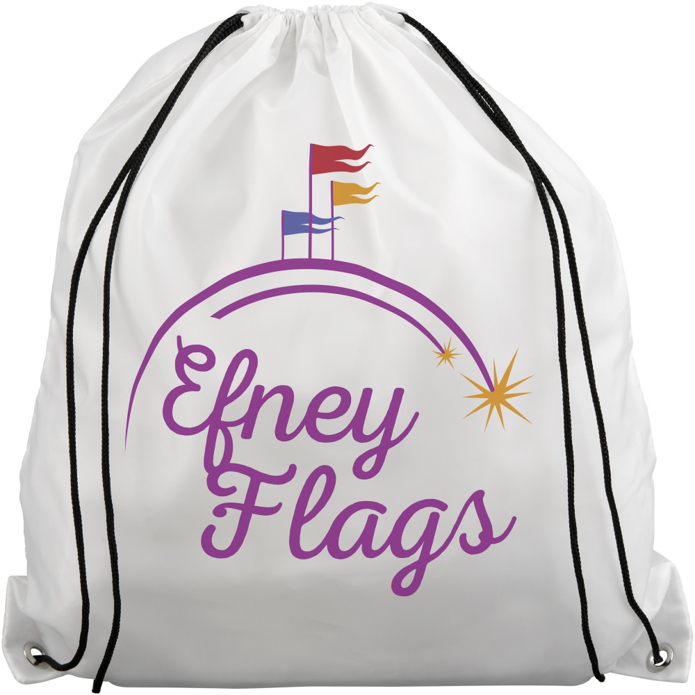 Tornazsák 100% -ban újrahasznosított műanyagból. Nagy tárolórész, fekete húzózsinórral. Mérete: 33*44 cm. Űrtartalom: 5 liter, teherbírás: 5 kg-ig. Emblémázás: Szitanyomás