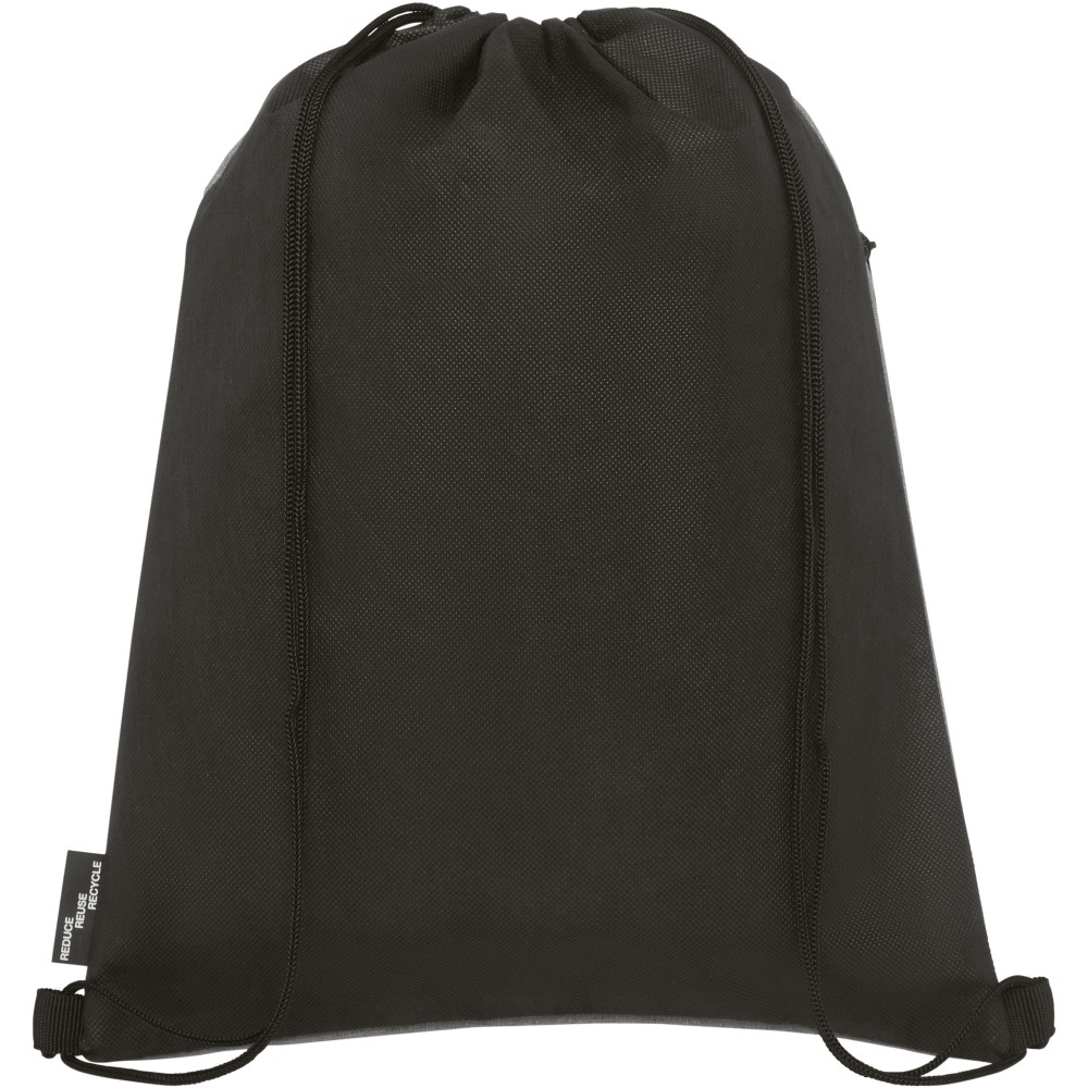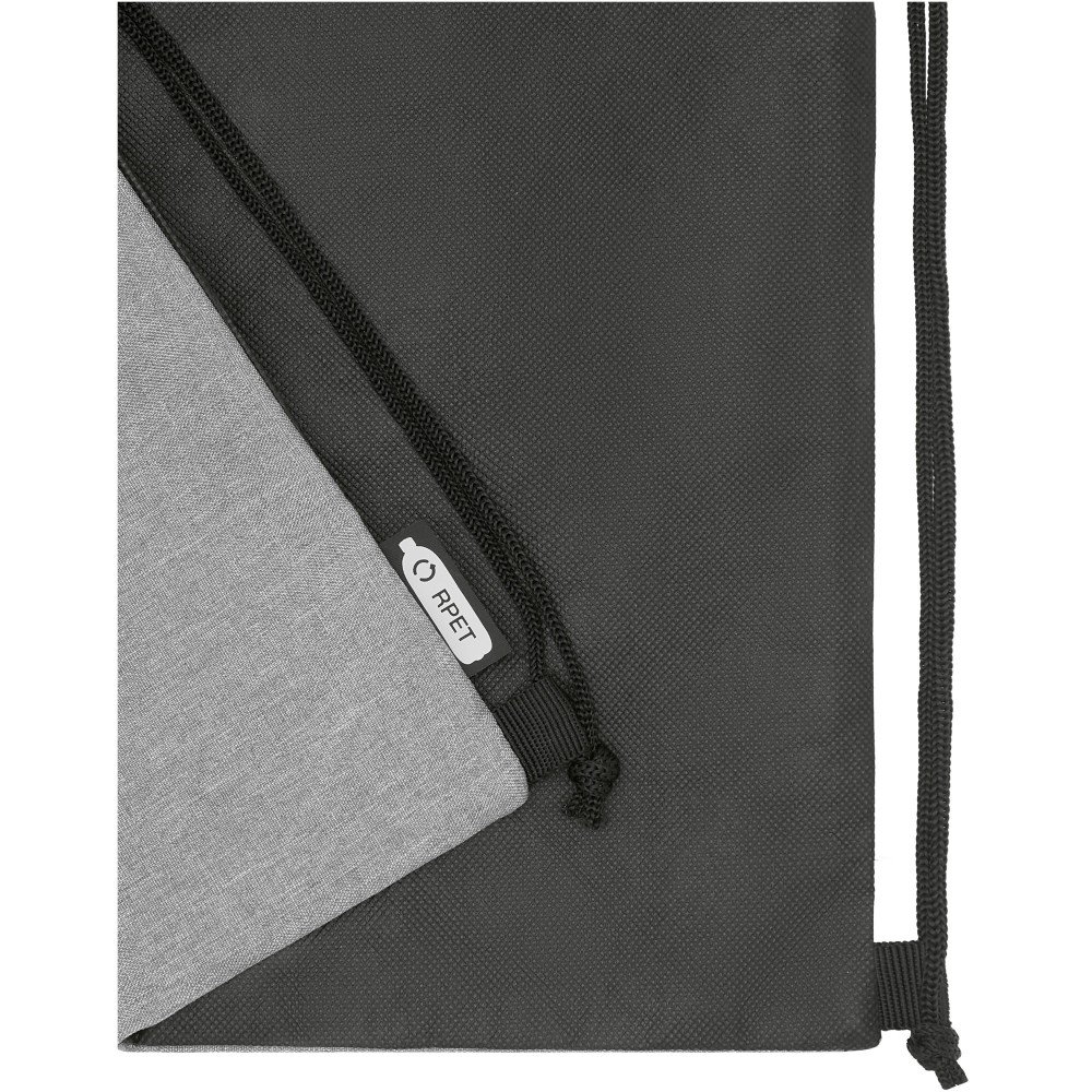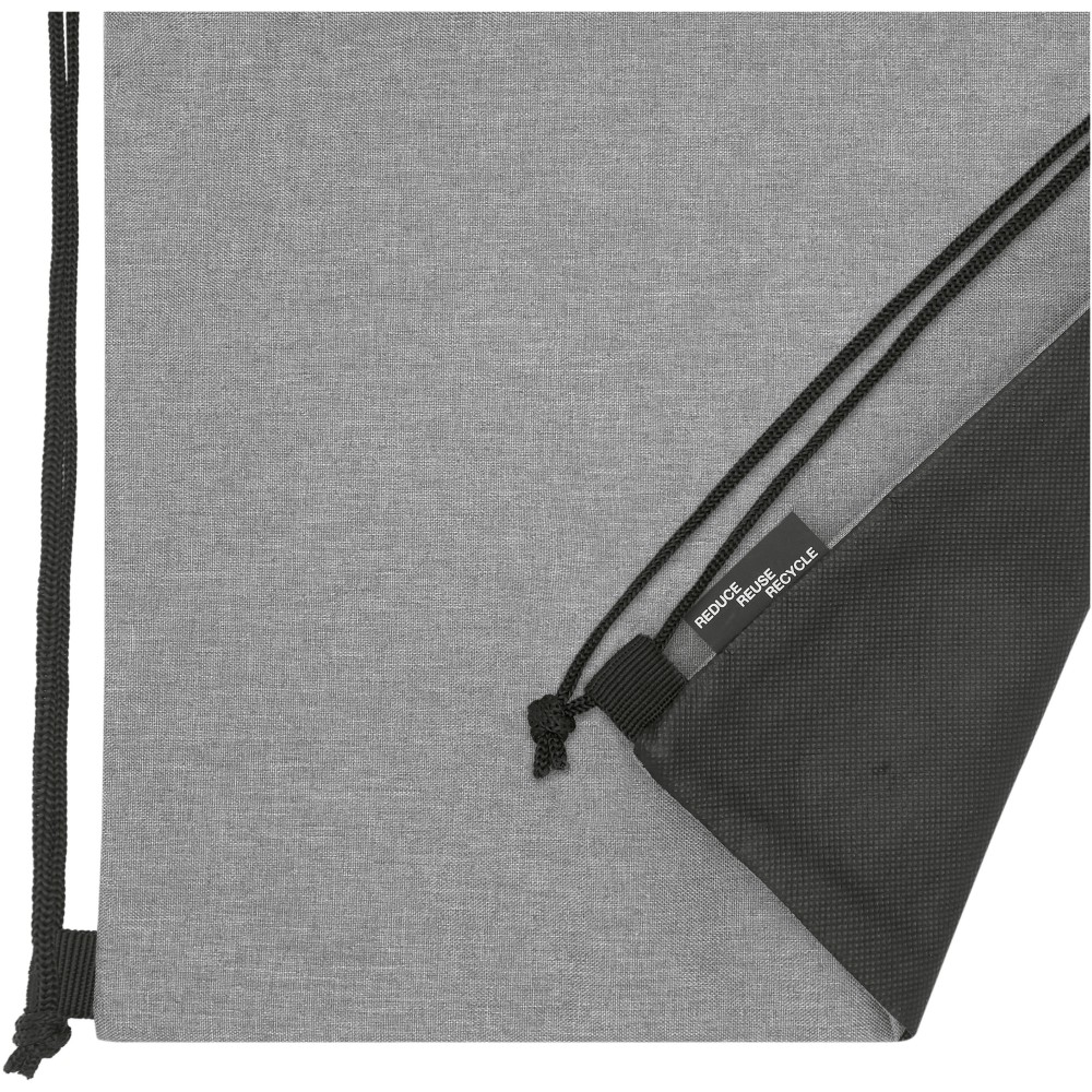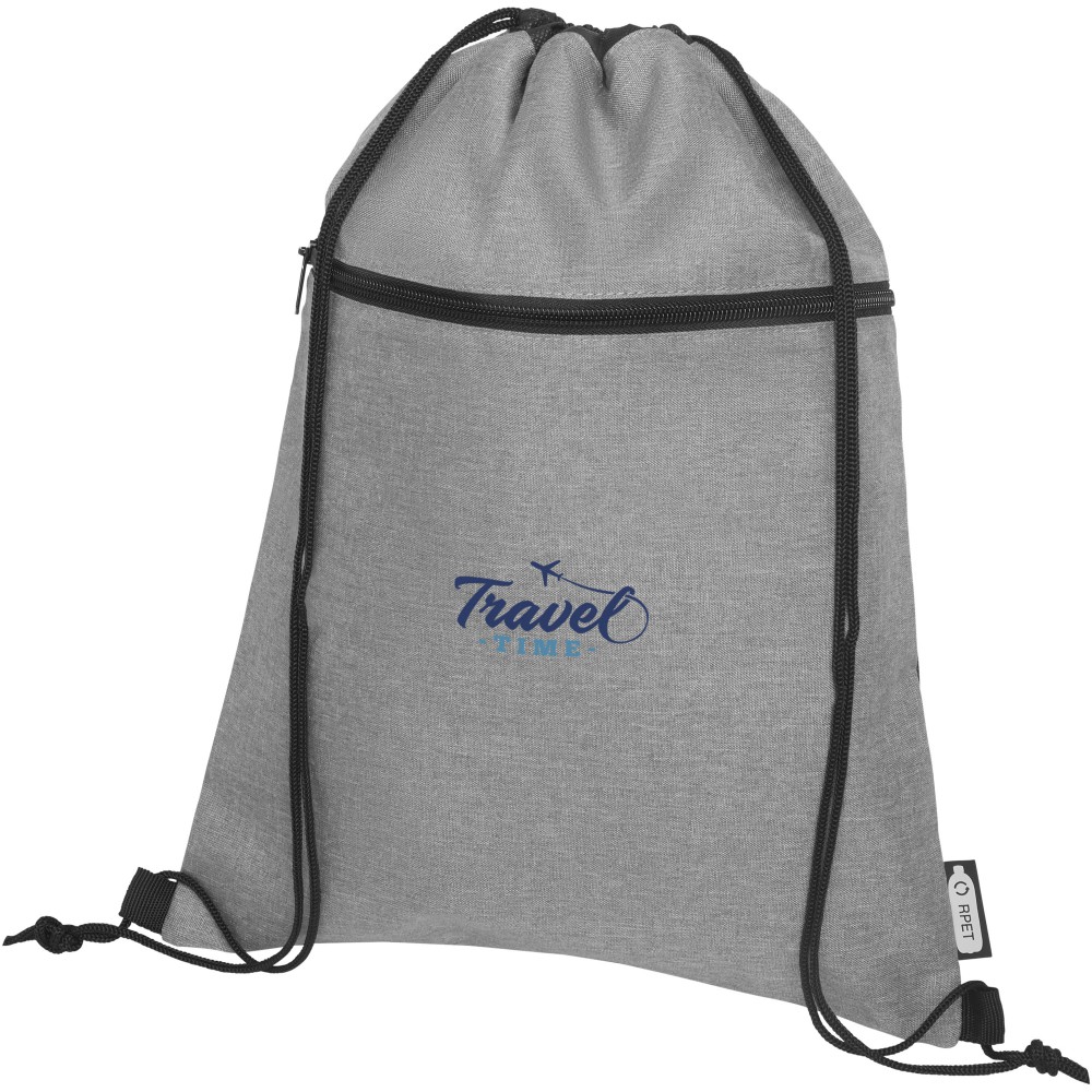 Tornazsák újrahasznosított RPET anyagból, fekete húzózsinórral, cipzáros zsebbel. Teherbírás 5 kg-ig. A termék színében kisebb eltérések lehetnek a festés, a szövés és a nyomtatás jellege miatt. 300D of újrahasznosított PET műanyag, újrahasznosított nemszőtt polipropilén, 80 g/m2. Emblémázás: Szitanyomás