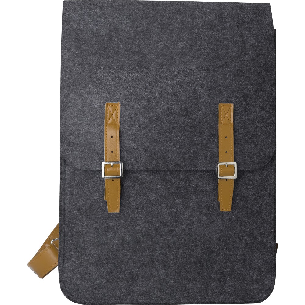 RPET filc hátizsák PU részletekkel. Egy nagy és egy kisebb zseb az elején. A táska két csattal záródik. Emblémázás: Hímzés, Szitanyomás