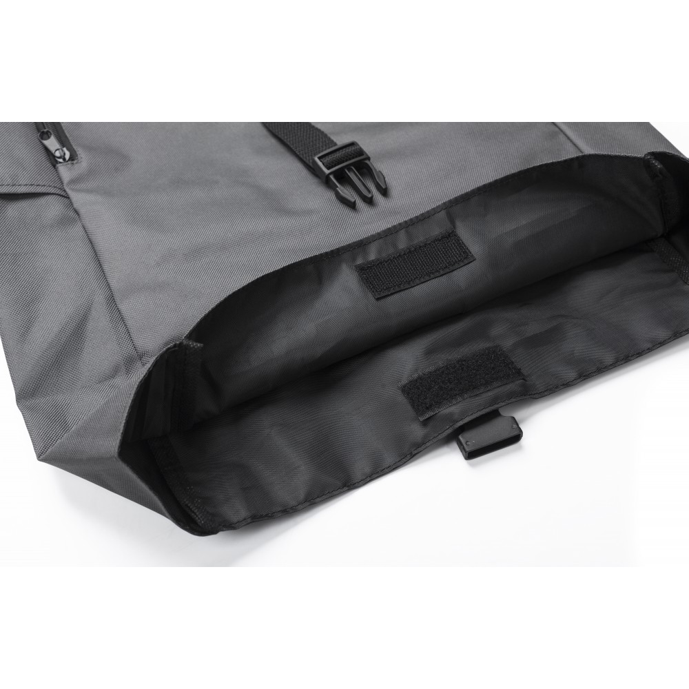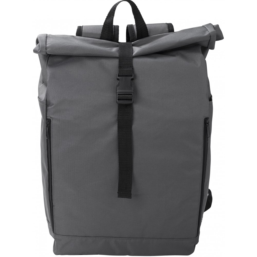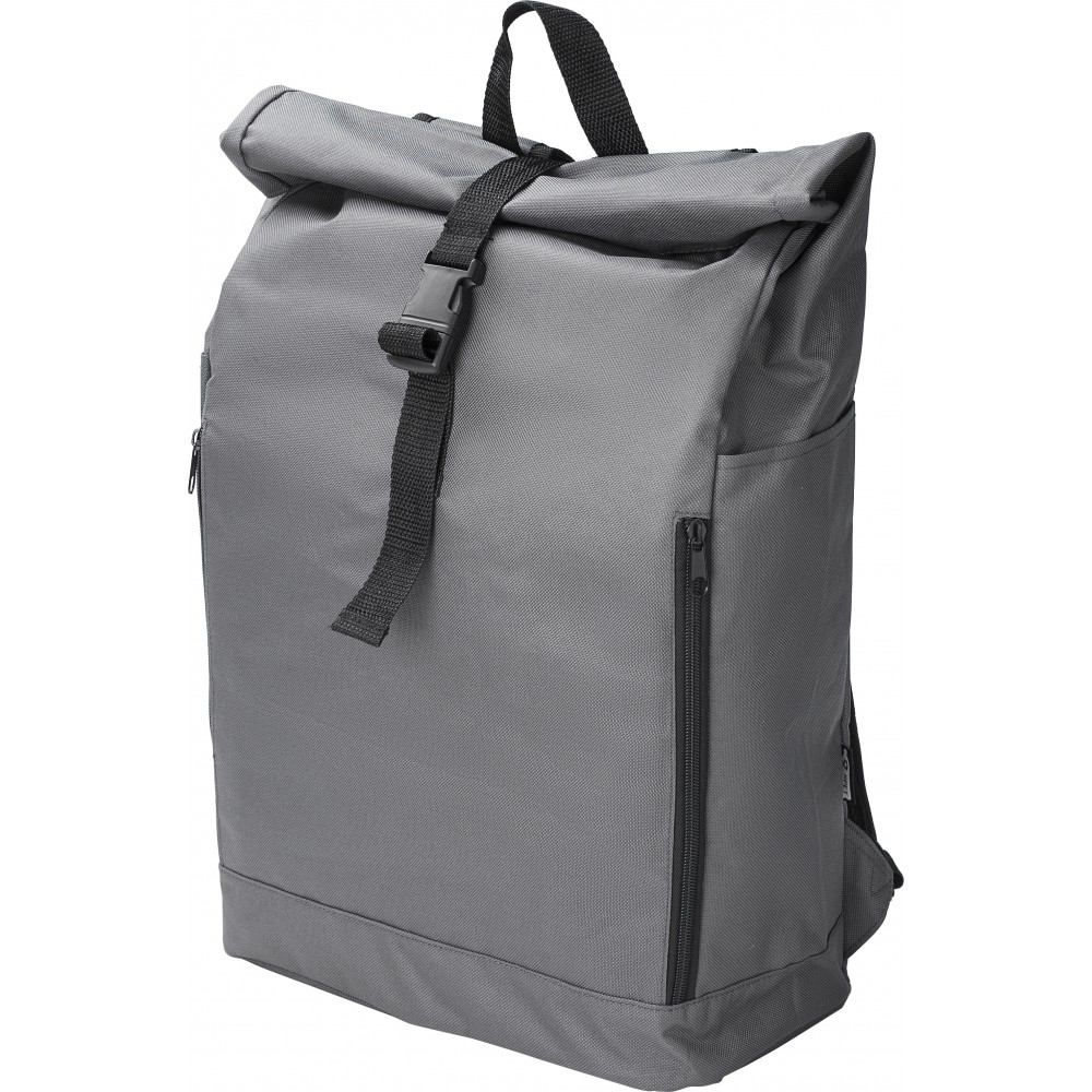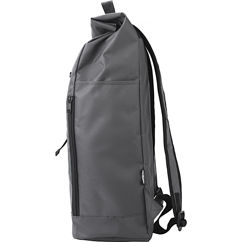 Rolltop hátizsák. Két cipzáras zseb az oldalán, egy nagy rekesz. Tépőzárral és csattal záródik. 600D RPET poliészter. Emblémázás: Hímzés, Szitanyomás