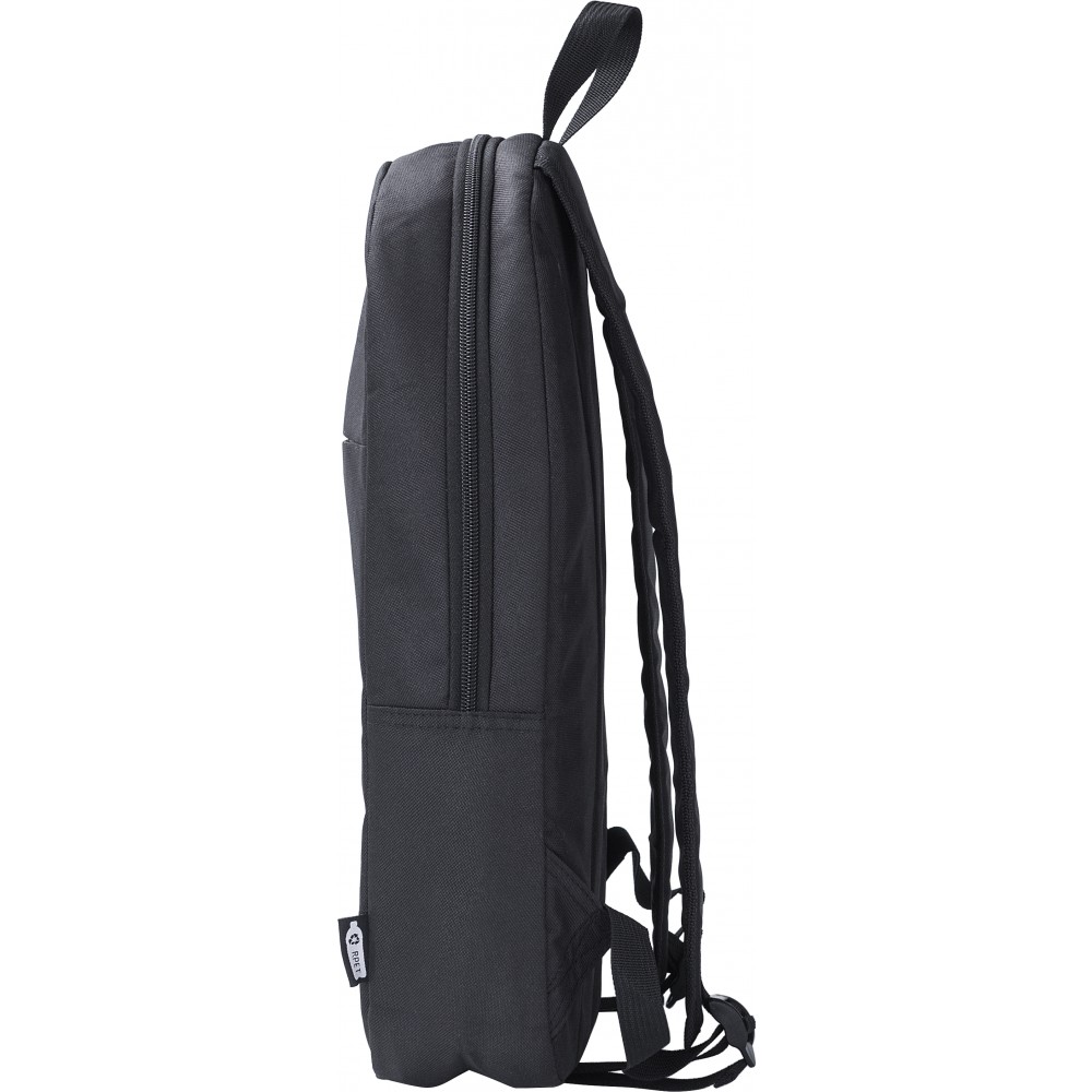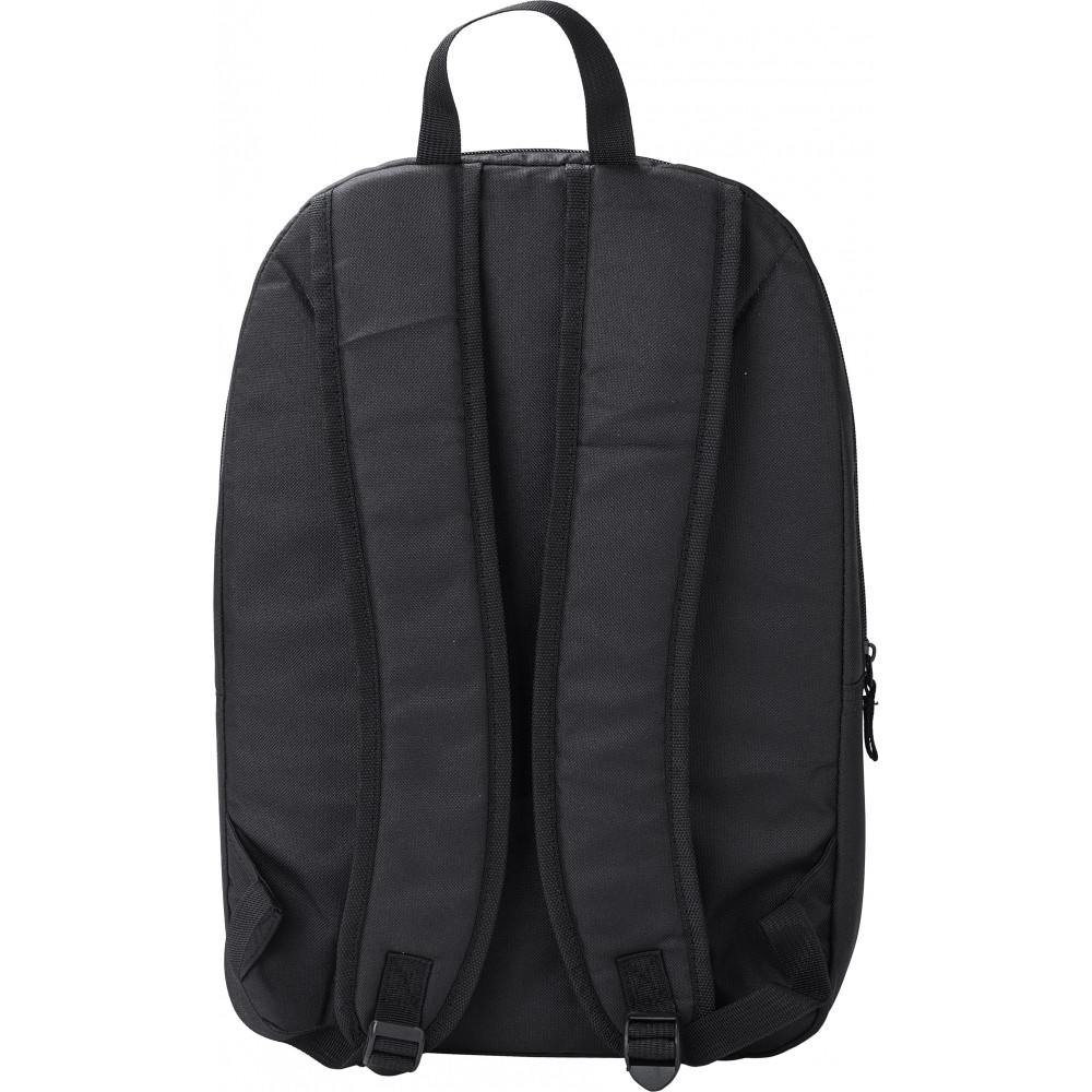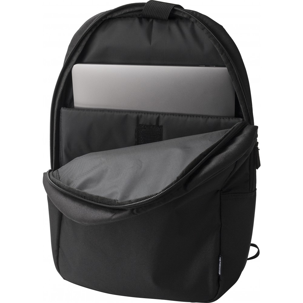 Basic laptop hátizsák 15"-es laptop számára. Egy nagy rekesz laptoptartóval. Az elején egy kis cipzáras zseb. 600D RPET poliészter. Emblémázás: Szitanyomás