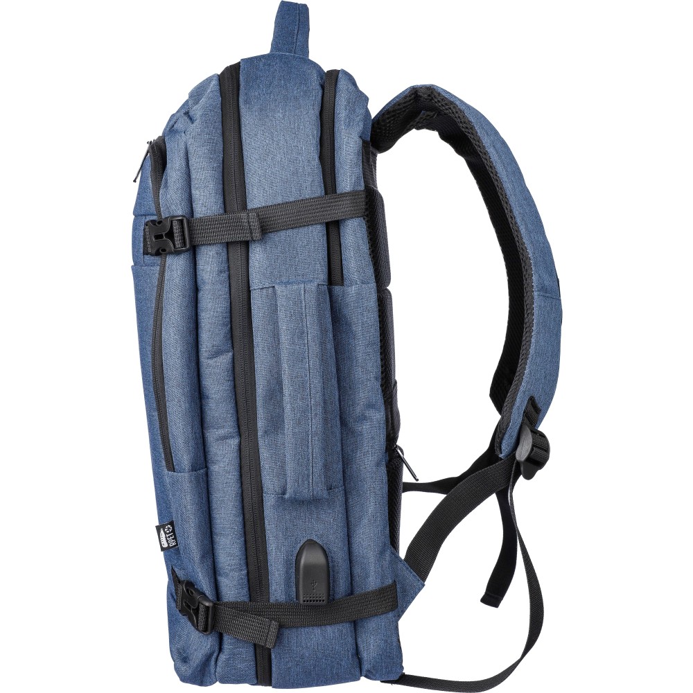 Hátizsák és laptoptáska 17"-es készülékhez. Kézipoggyász méretű. Hordozófüllel a tetején és oldalain. Tépőzáras laptop rekesszel, lopásgátló zsebbel és két nagy cipzáras rekesszel. Szellőző, párnázott hátoldallal, bőröndre húzható pánttal, zárócsatokkal és oldalsó USB-A porttal rendelkezik. Oldalsó csatok segítik a csomag kompakt tartását. Terhelhetősége kb. 12 kg. RPET alapanyagra utaló címke. Anyaga: 300D rPET poliészter. Emblémázás: Szitanyomás