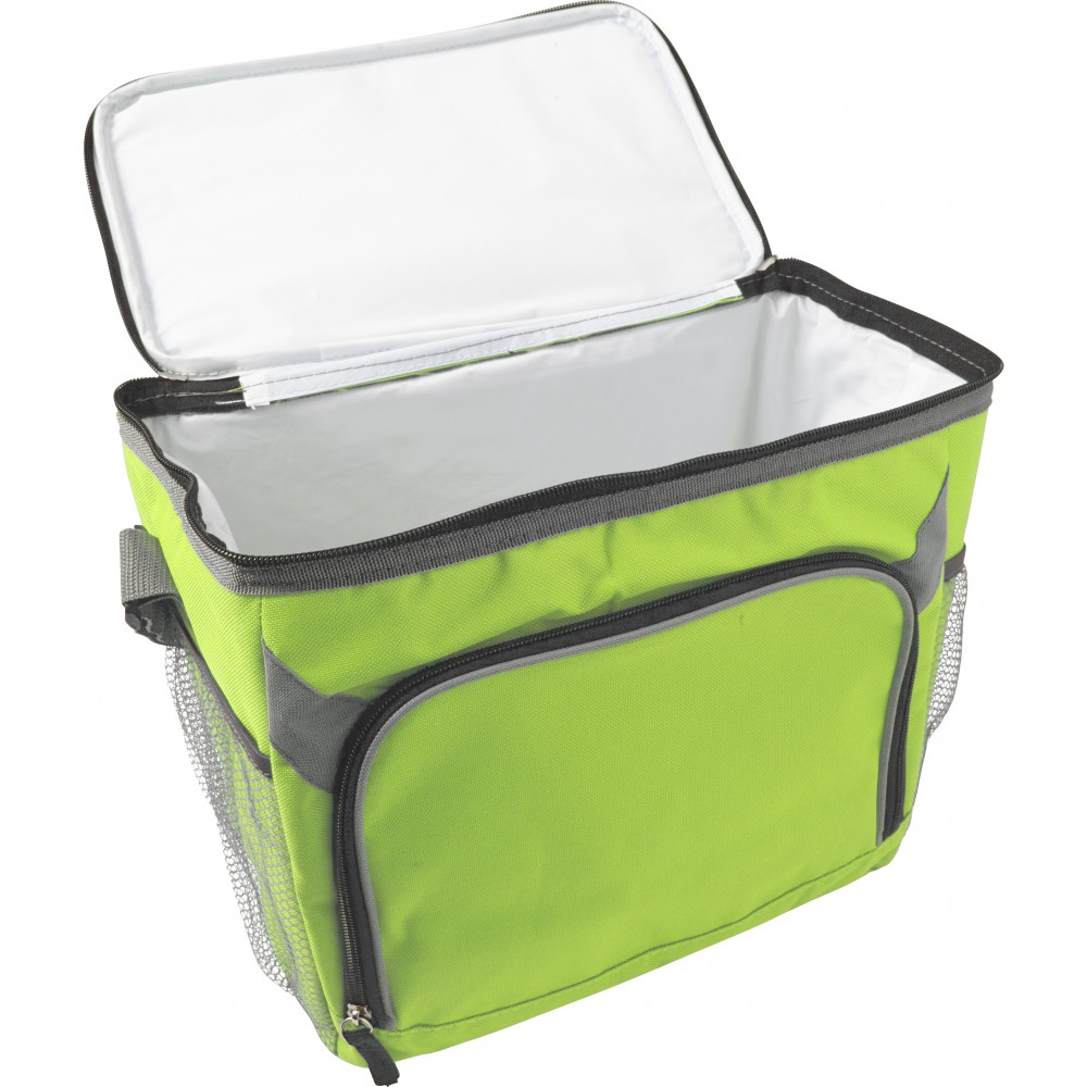 Hűtőtáska nagy cipzáros elsőzsebbel és mindkét végén hálós zsebekkel. 600D poliészter. Emblémázás: Szitanyomás