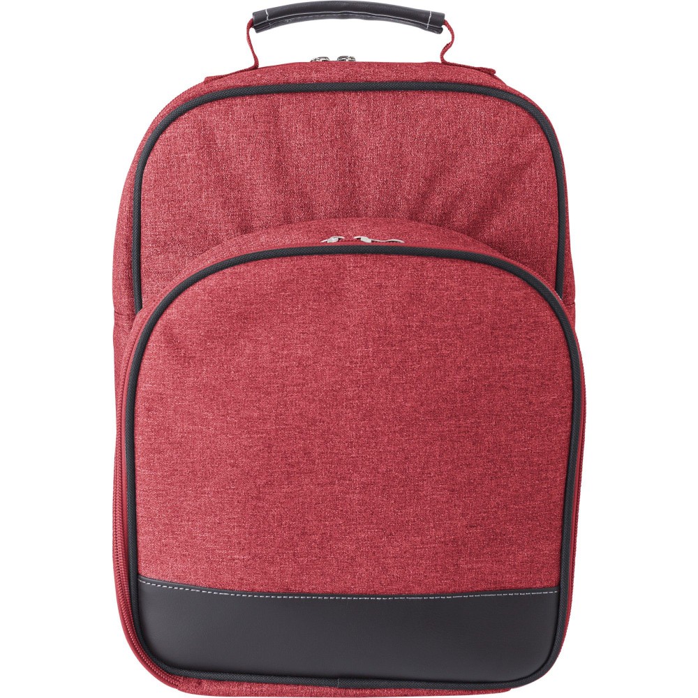 Piknik hűtőhátizsák alumínium fólia béléssel. Egy nagy főrész, egy cipzáros elsőzseb evőeszközökkel és tányérokkal, állítható vállpánt. 600D művászon. Emblémázás: Szitanyomás