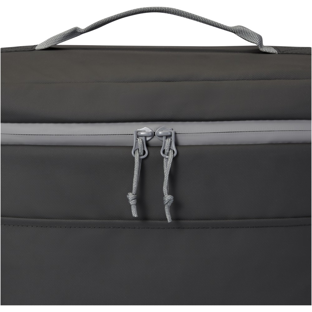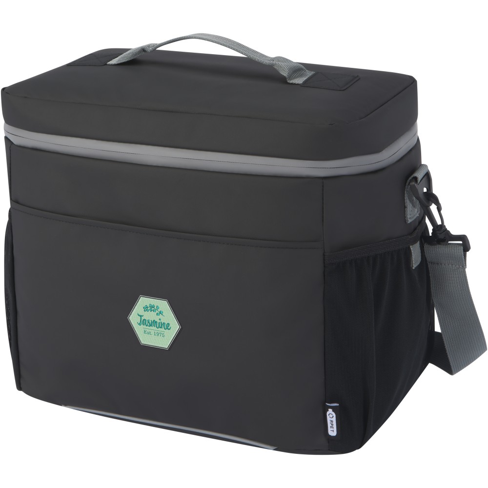 Vízálló 20 dobozos hűtőtáska, amely GRS tanúsítvánnyal rendelkező újrahasznosított anyagokból készült, beleértve a cipzárakat is. Tágas, cipzáras rekesszel rendelkezik, amely élelmiszer-biztonságos és extra vastag, nagy sűrűségű hőszigetelő PEVA és habszigeteléssel van bélelve, így az italok és frissítők órákig hidegen maradnak. Emellett 2 hálós zsebbel és egy nyitott elülső zsebbel rendelkezik további tárolási lehetőségként. A hevederes fogantyú és az állítható és párnázott vállpánt kényelmessé teszi a hordozást. A GRS újrahasznosított anyagai közé tartozik a főszövet, a bélés, a hevederek és a cipzárak. Nem mosható. Űrtartalom: 22 liter. PVC-mentes. Emblémázás: Szitanyomás