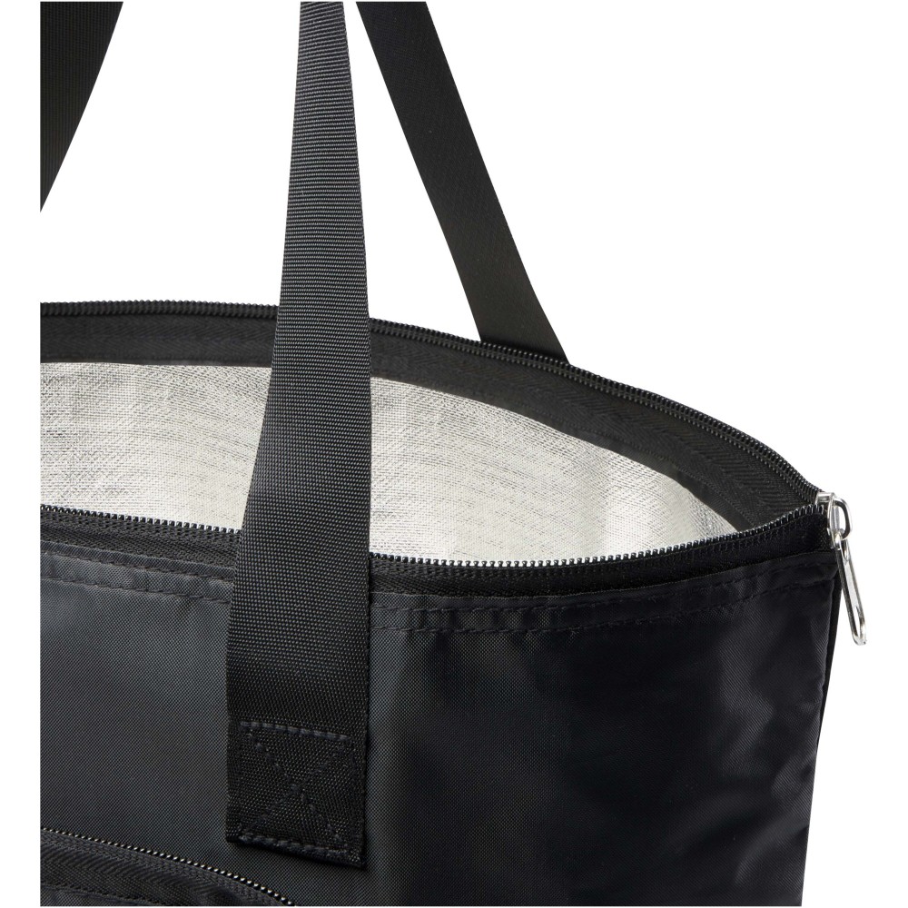 Ez a könnyű, mégis tartós hűtőtáska a kényelem és praktikusság jegyében készült, és könnyedén a kompakt tasakba hajtható, amelyen hurok található a kényelmes hordozás érdekében - tökéletes piknikhez, bevásárláshoz vagy szabadtéri programokhoz. Cipzáras, alumínium fóliával bélelt főrekesszel, nyitott elülső zsebbel és két hosszú, sima szövött anyagból készült fogantyúval rendelkezik. PVC-mentes újrahasznosított poliészterből készült. Űrtartalma: 15 liter. Emblémázás: Szitanyomás