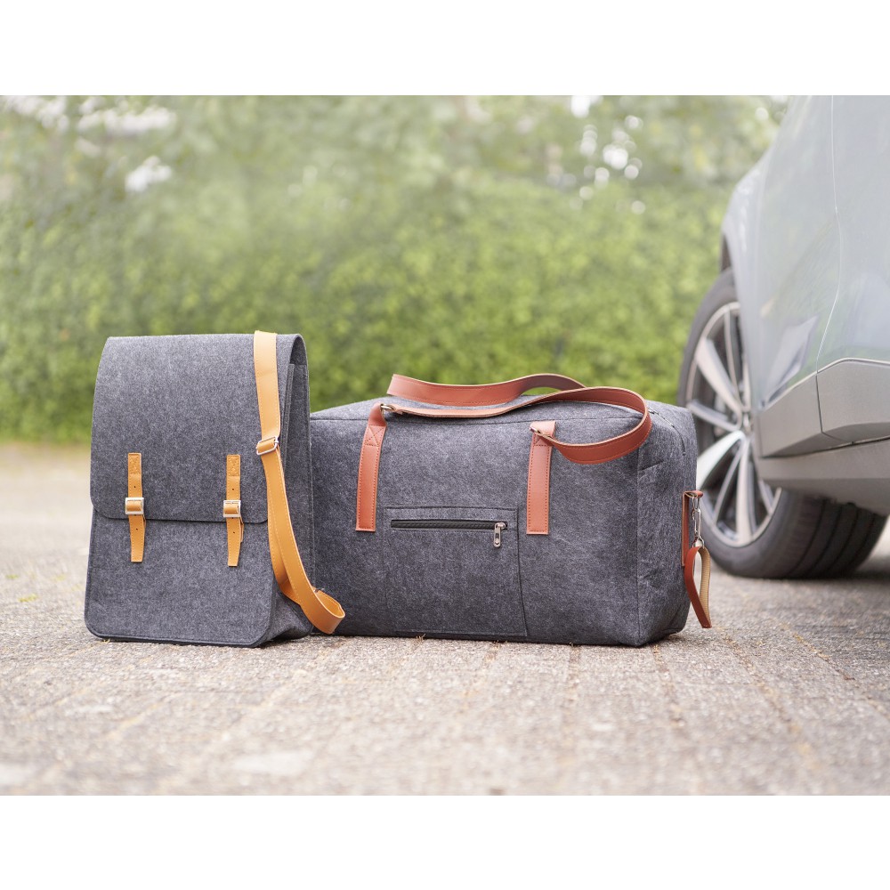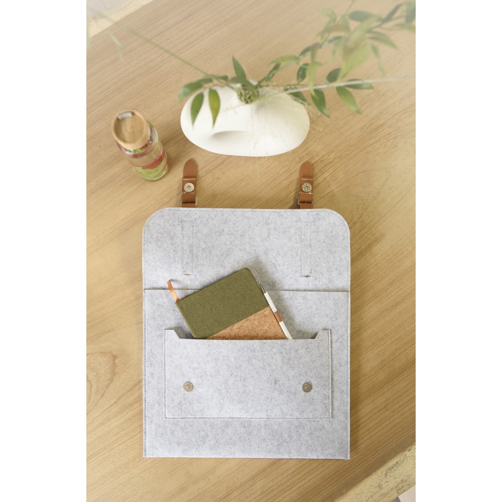 RPET filcből készült irattáska PU részletekkel. Egy nagy rekesz. A táska két csattal záródik. Emblémázás: Hímzés, Szitanyomás