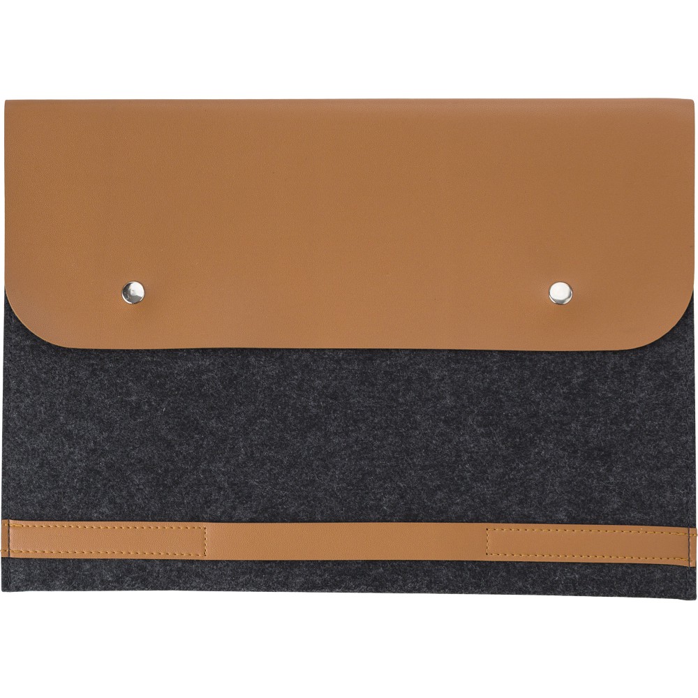 RPET filc laptoptáska 14 -es laptop számára PU részletekkel. Két gombbal záródik. Emblémázás: Szitanyomás