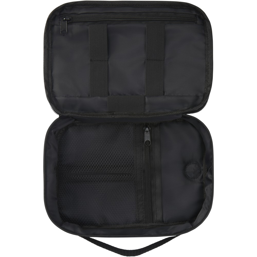 A Ross GRS újrahasznosított tech-táska ideális az állandóan úton lévők számára, és rendezetten tarthatja a powerbankokat, töltőkábeleket vagy bármilyen más elektronikus kiegészítőt. Több zsebbel, elasztikus hurokkal és egy kábelátvezető résszel rendelkezik, amely lehetővé teszi a powerbank tárolását, miközben a telefont tölti. Egy műanyag karabinerrel is rendelkezik egy másik táskához való rögzítéshez. Űrtartalom: 1 liter. Emblémázás: Szitanyomás