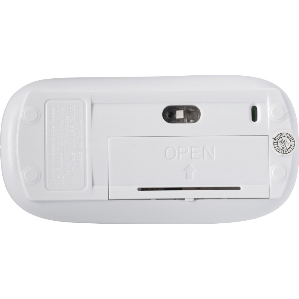 Vezeték nélküli optikai egér, 2,4Ghz. Energiatakarékos egér rejtett Nano vevőegységgel és görgetővel. Az elemet tartalmazza. ABS műanyag. Emblémázás: Tamponnyomás