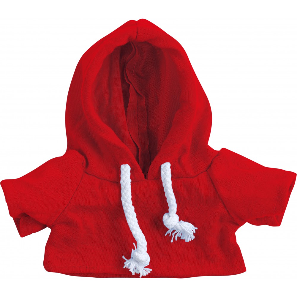 Plüssmackó színes kapucnis pólóban, fehér húzózsinórral. Szeme hímzett. Emblémázás: Szitanyomás