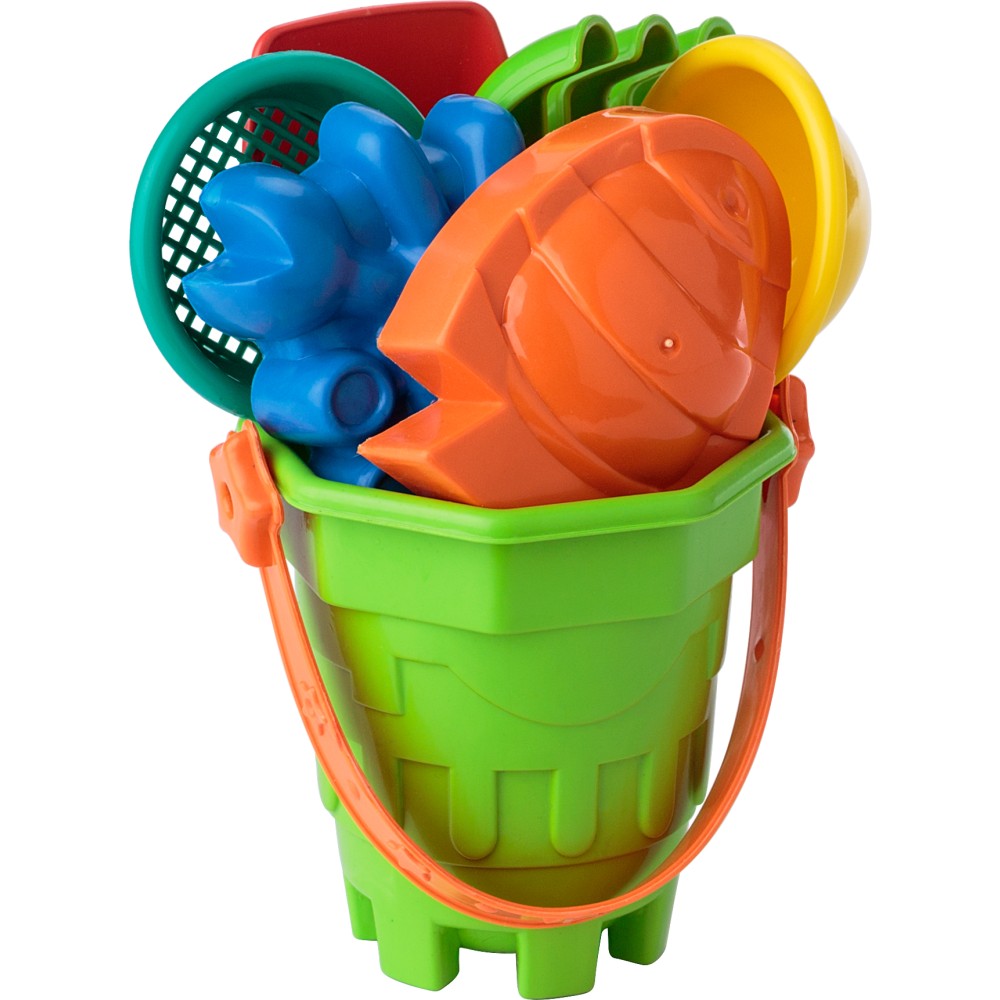 Újrahasznosított PP homokozóvödör (4 színben vegyesen). Minden vödör tartalmaz lapátot, gereblyét, kanalat, szitát és két homokozóformát. Egyenként hálóba csomagolva, kartonkártyával együtt érkezik. Emblémázás: Matricázás