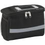 Kerékpáros hűtőtáska 600D poliészterből, PEVA béléssel, a tetején PVC zsebbel. Fényvisszaverő pánttal, mindkét oldalán hálós zsebekkel és nagy, cipzáros hűtőrekesszel. Emblémázás: Szitanyomás