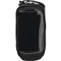 Kormányra szerelhető biciklistáska fényvisszaverő csíkokkal, telefontartóval. A PVC telefontartó zseb nem akadályozza az érintőképernyős telefonok kezelését sem. A táska egyik oldalán nyílás található a fülhallgató kivezetéséhez. A kormányra tépőzárral rögzíthető. 600D poliészter és PVC. Emblémázás: Szitanyomás