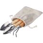 Kerti szerszámkészlet, amely két különböző lapátot és egy gereblyét tartalmaz. Az eszközök rozsdamentes acélból készültek, a nyelek fából. Egyenként pamut zsinóros tasakba csomagolva. Anyaga: rozsdamentes acél és fa. Emblémázás: Szitanyomás