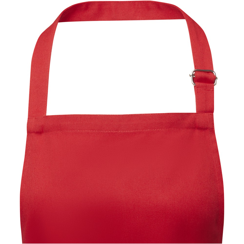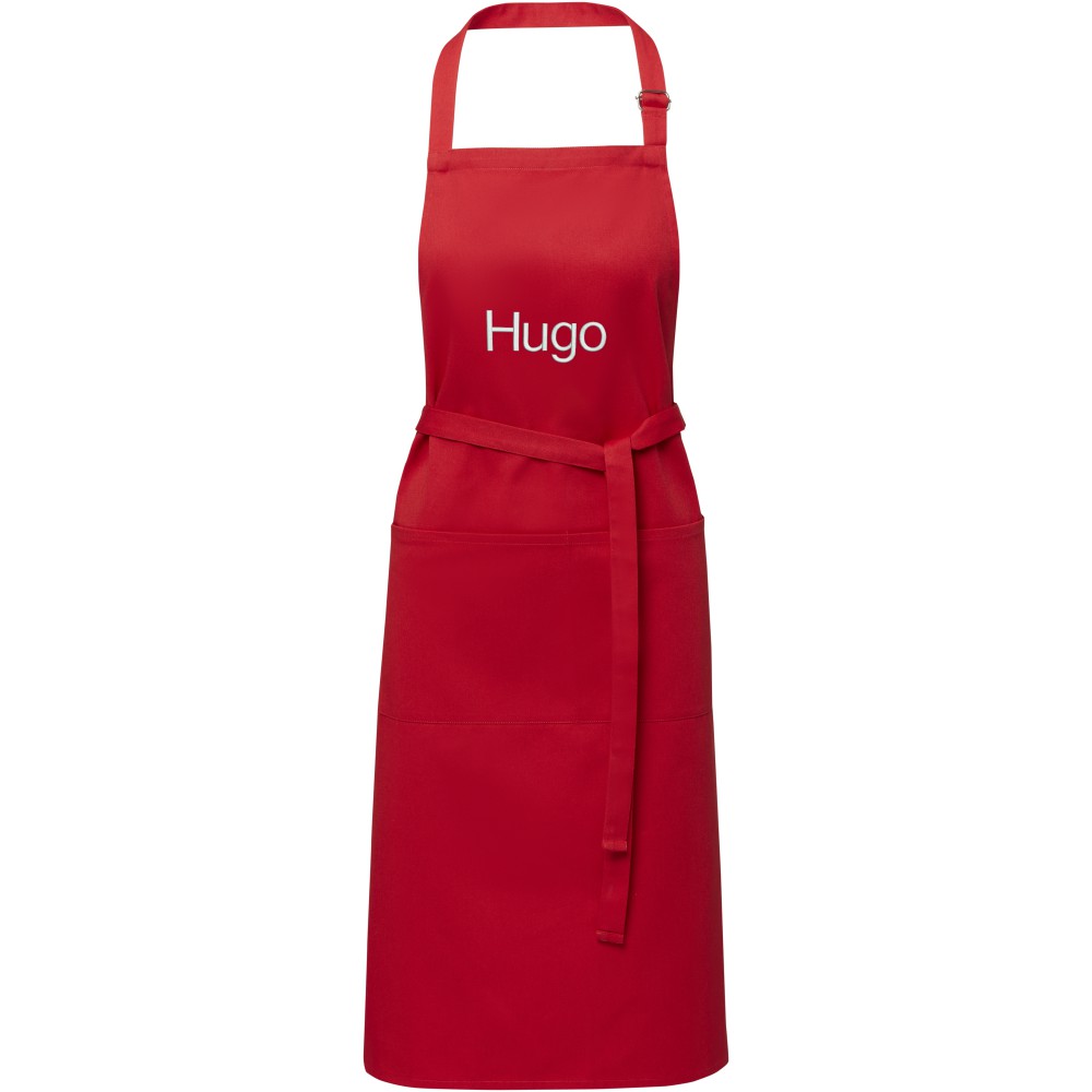 Vastag és masszív anyag, ugyanakkor puha és kényelmes viselet. A két elülső zseb gyors és egyszerű módot kínál a konyhai eszközök tárolására. A kötény nyakában csattal állítható, hátul megköthető. Nagyméretű nyomtatási lehetőség a logók megjelenítéséhez. Pamut twill 65% poliészterből és 35% pamutból, 240 g/m2. Emblémázás: Hímzés, Szitanyomás