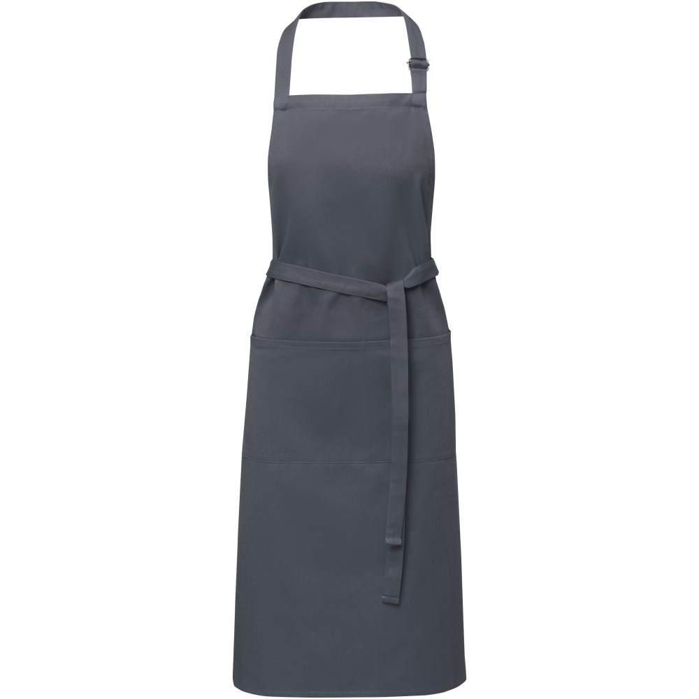 Vastag és masszív anyag, ugyanakkor puha és kényelmes viselet. A két elülső zseb gyors és egyszerű módot kínál a konyhai eszközök tárolására. A kötény nyakában csattal állítható, hátul megköthető. Nagyméretű nyomtatási lehetőség a logók megjelenítéséhez. Pamut twill 65% poliészterből és 35% pamutból, 240 g/m2. Emblémázás: Hímzés, Szitanyomás