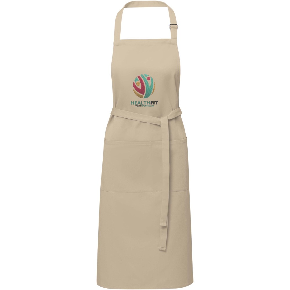 Vastag és masszív anyag, ugyanakkor puha és kényelmes viselet. A két elülső zseb gyors és egyszerű módot kínál a konyhai eszközök tárolására. A kötény nyakában csattal állítható, hátul megköthető. Nagyméretű nyomtatási lehetőség a logók megjelenítéséhez. Pamut twill 65% poliészterből és 35% pamutból, 240 g/m2. Emblémázás: Hímzés, Szitanyomás