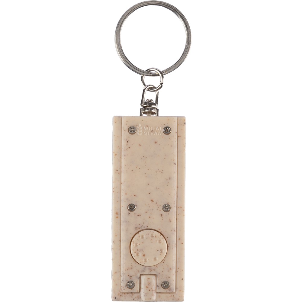 Szalma felhasználásával készült kulcstartó egy LED-es lámpával, fém kulcskarikával és nyomógombbal. Emblémázás: Tamponnyomás