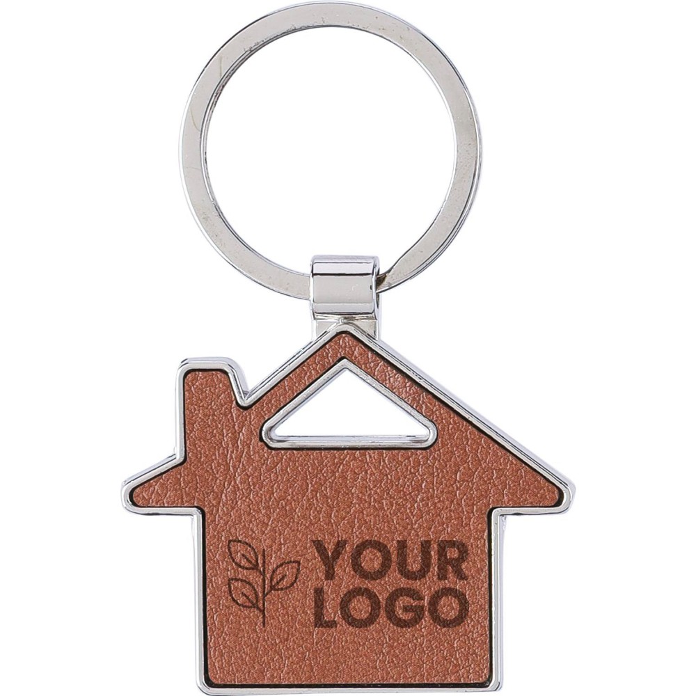 Kulcstartó ház alakú, újrahasznosított bőrből, fém karikával. Oldalán dombornyomott újrahasznosított bőr anyagra utaló logóval. Egyenként barna kartonhüvelybe csomagolva. Anyaga: újrahasznosított bőr. Emblémázás: Gravírozás