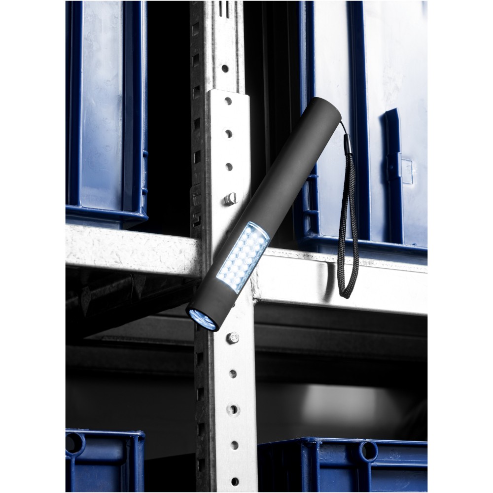 Vékony, mágneses zseblámpa három beállítási móddal. Az első mód 4 LED-es jelzőfény, a második mód 24 LED-es fény, a harmadik módban pedig a két előbbi mód egyszerre aktív. A mágneses hátoldalánál fogva könnyen tárolható vagy használat közben könnyedén rögzíthető bármilyen fém felülethez. Nyomógombos be-/kikapcsolás. Nylon tartópánttal. Csomagolás: STAC ajándékdobozban. Az elemek a csomagban vannak és be vannak helyezve. Exkluzív kivitel. Emblémázás: Gravírozás, Tamponnyomás