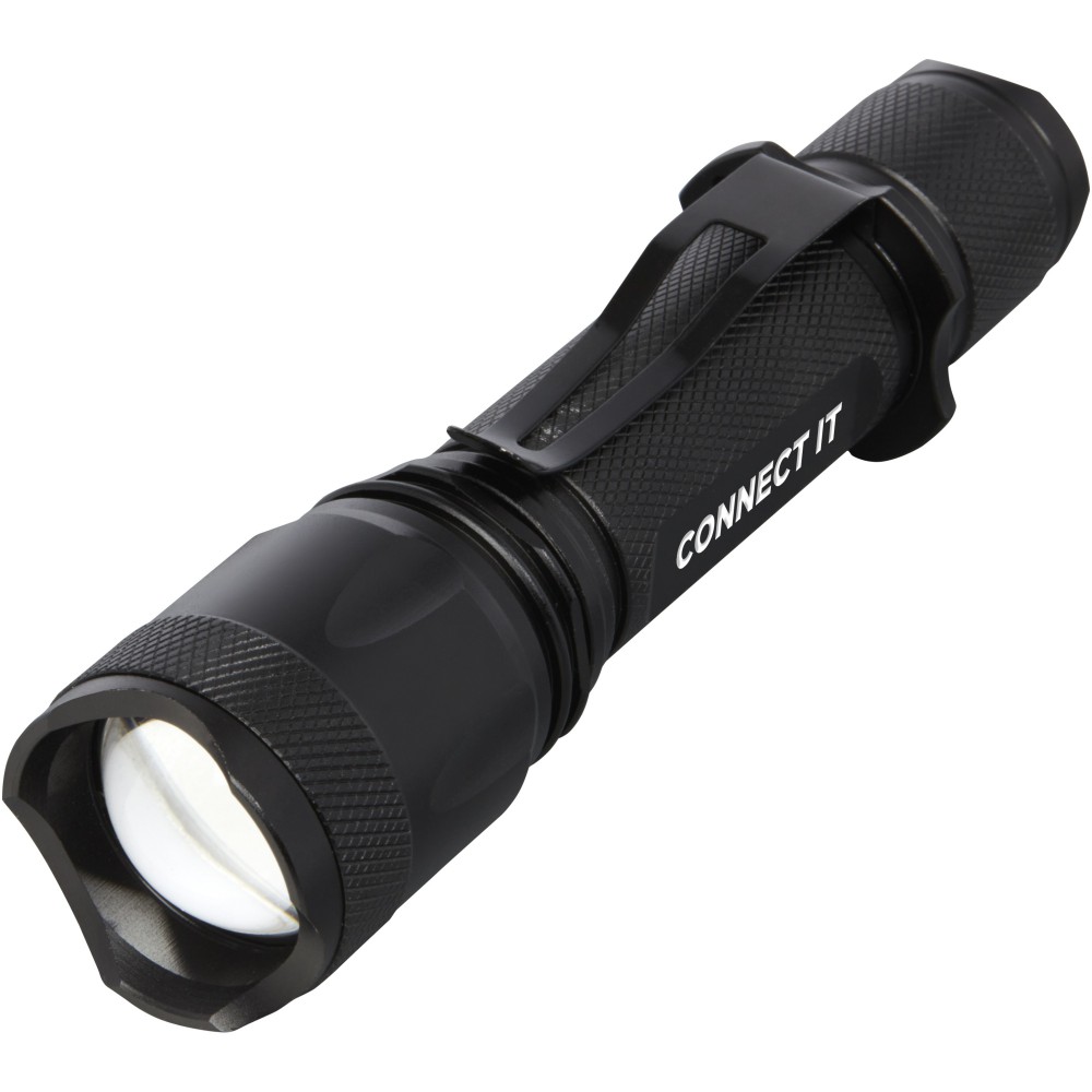 Soha nem merül le az akkumulátor ezzel az újratölthető, nagy teljesítményű taktikai alumínium zseblámpával. A tömör fekete alumíniumötvözet burkolat profi megjelenést biztosít, 1 méteres ütésállósággal. A zseblámpa övcsipesszel rendelkezik a könnyű hordozhatóság érdekében, és az IPX4 besorolású, fröccsenésálló. Az 5 W-os LED 300 lumen fényerőt állít elő 3 órán keresztül, sugártávolsága pedig 200 méter 5 különböző fénybeállítással: magas, közepes, alacsony, villogó és SOS. A nagy teljesítményt egy beépített lítium akkumulátor adja, amelynek kapacitása 2000 mAh. Rejtett USB csatlakozó a töltéshez, amely a lámpa felső részének kihúzásakor válik elérhetővé. A zseblámpa mérete 14,5 x 3,4 cm, súlya pedig mindössze 170 gramm. Használati útmutatóval adjuk, és 17,5 x 6 x 4 cm-es újrahasznosított karton díszdobozba csomagoljuk. Az alumínium testre lézeres gravírozás javasolt. Emblémázás: Gravírozás