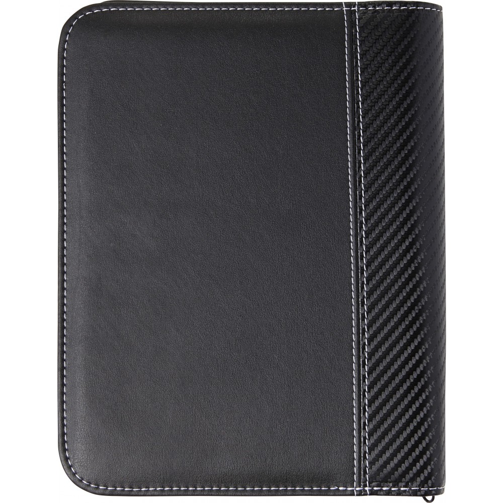 Cipzáros A5 irattartó PU borítással, fehér díszítő tűzésekkel, tolltartó hurokkal, hat különböző méretű zsebbel, 30 lapos, vonalas jegyzettömbbel, mikroszálas béléssel. A tollat nem tartalmazza. Emblémázás: Szitanyomás, Tamponnyomás