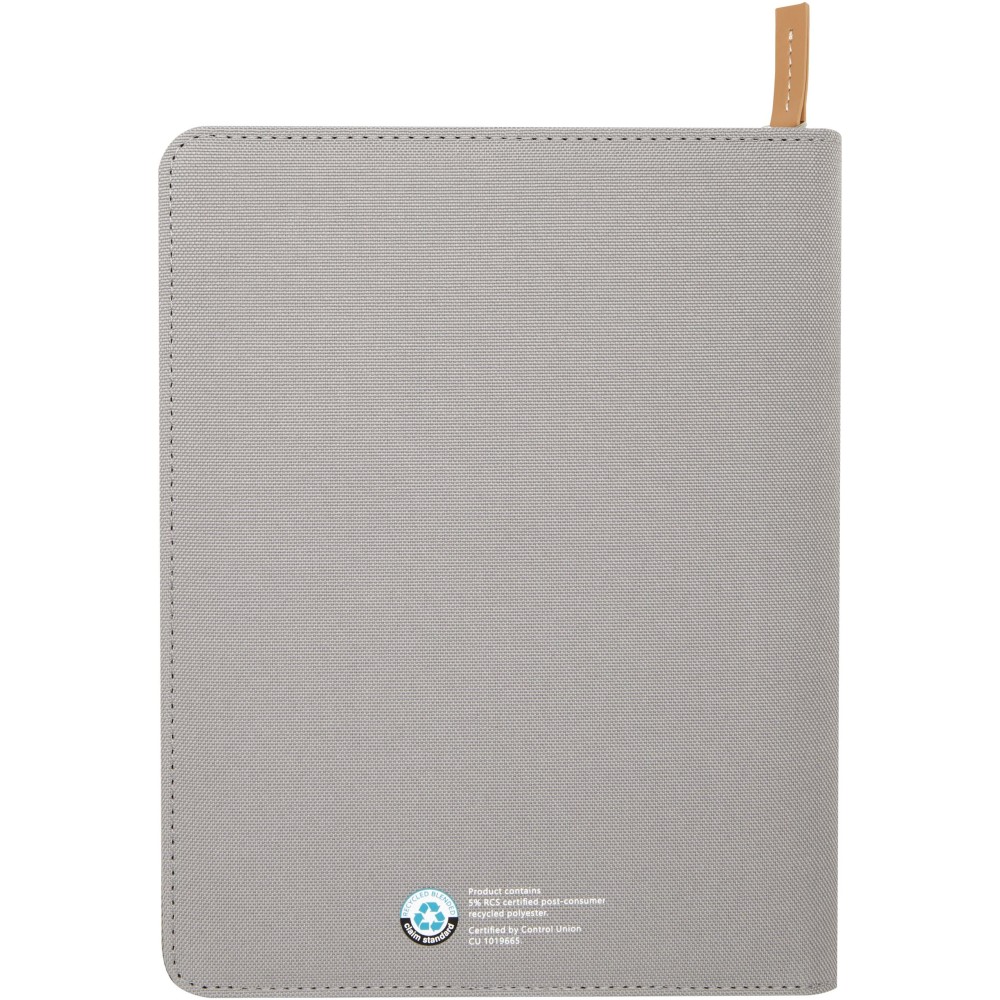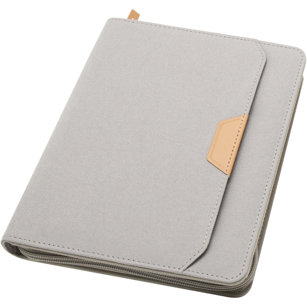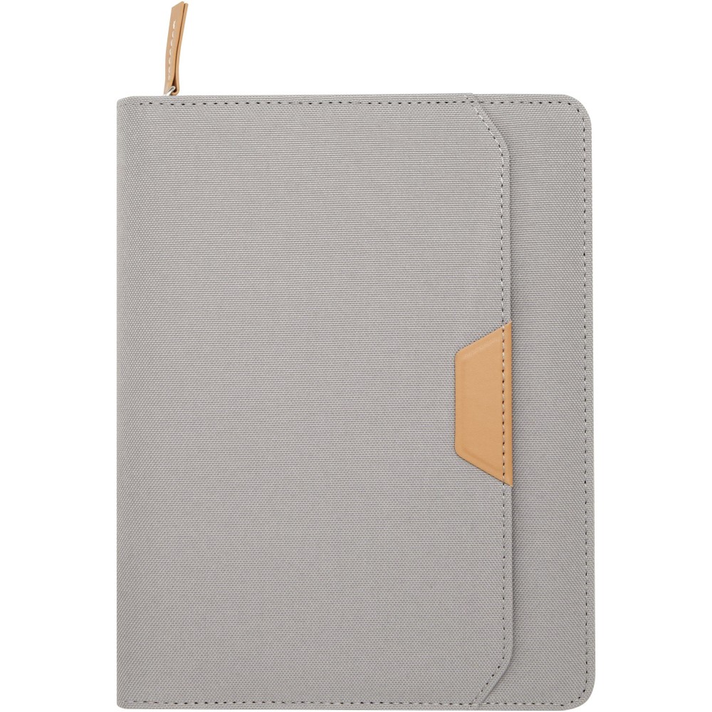 A Nomumi A5 portfólió lekerekített sarkú, újrahasznosított műanyagból készült, praktikus irodai alapdarab. 64 db krém színű, 80 g/m2 vonalas lapot tartalmaz, cipzáros záródással, tollhurokkal és egy zsebbel rendelkezik. Emblémázás: Szitanyomás