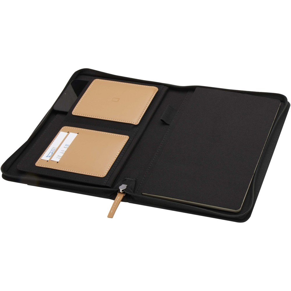A Nomumi A5 portfólió lekerekített sarkú, újrahasznosított műanyagból készült, praktikus irodai alapdarab. 64 db krém színű, 80 g/m2 vonalas lapot tartalmaz, cipzáros záródással, tollhurokkal és egy zsebbel rendelkezik. Emblémázás: Szitanyomás