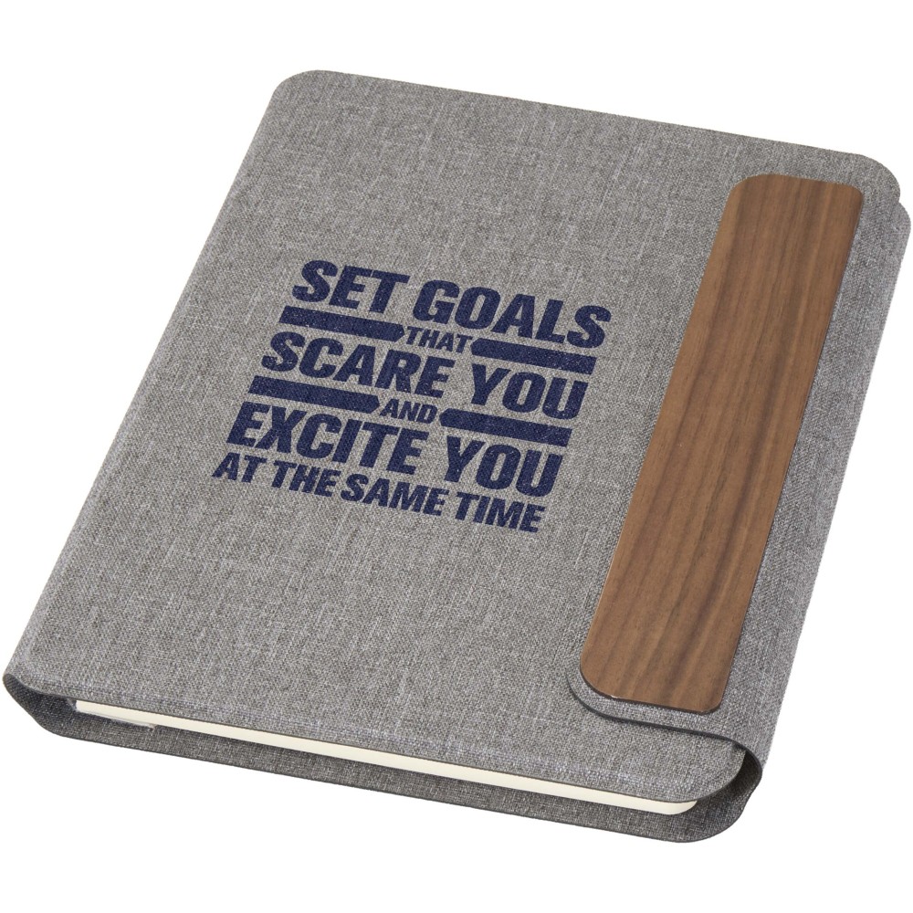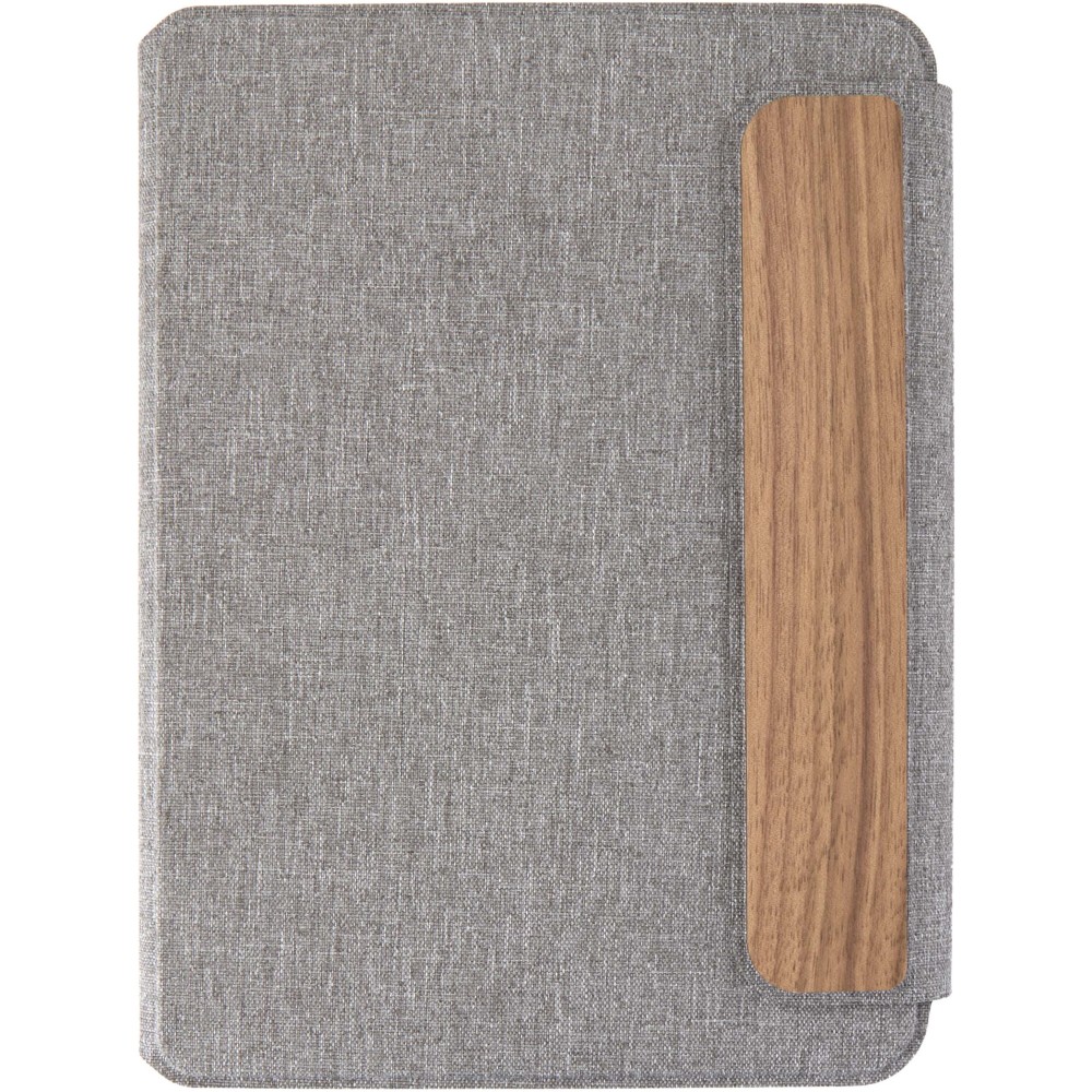 Az Andean A5 portfólió részben RCS tanúsítvánnyal rendelkező, újrahasznosított, fogyasztás utáni poliészterből készül, így fenntarthatóbb alternatívát kínál, csökkentve az új alapanyagok felhasználását. Elegáns, lekerekített sarkú, szürke kemény borítóját precíziós hegesztési technológia és mágneses zárás egészíti ki, amelyet kifinomult diófa részlet díszít, modern és letisztult megjelenést kölcsönözve. Belsejében egy kivehető, puhafedeles jegyzetfüzet található, amely 64 krémszínű, vonalazott, 80 g/m2 tömegű, felelősen beszerzett papírból készült lapot tartalmaz. Kraft színű papírtokban kerül átadásra. Emblémázás: Szitanyomás