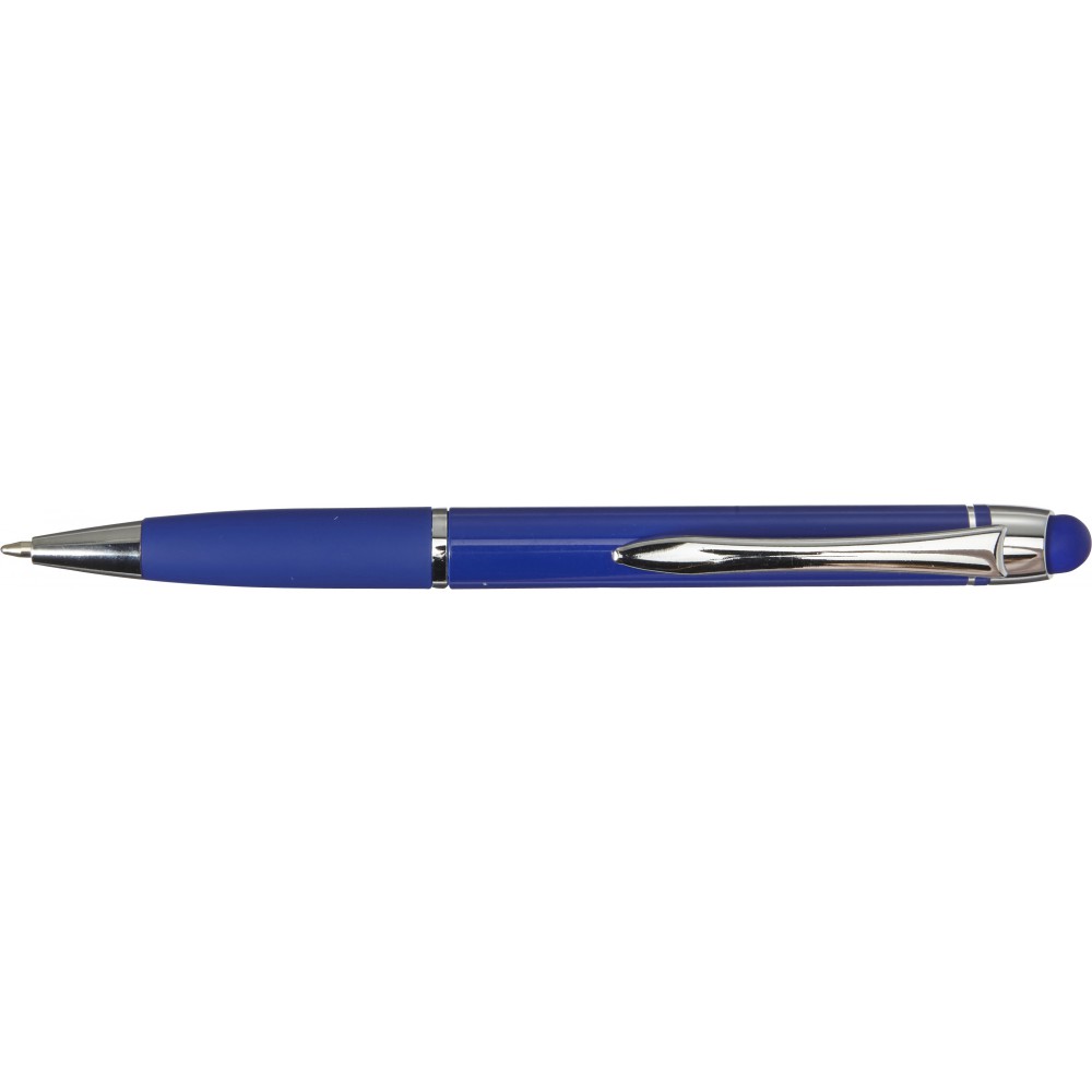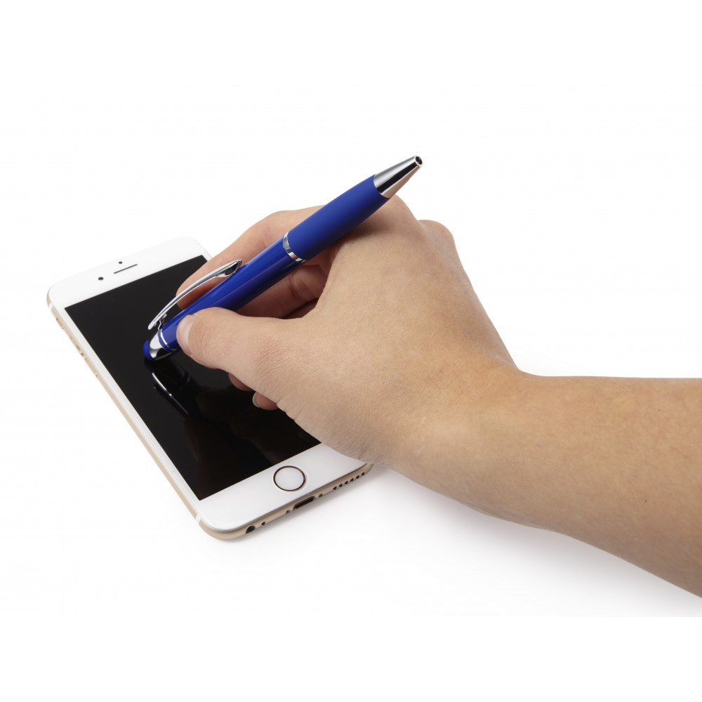 Golyóstoll érintővel, fényes felülettel, színben illeszkedő gumis fogórésszel, fényes ezüst kiegészítőkkel, fekete tollbetéttel. Alumínium. Emblémázás: Gravírozás, Tamponnyomás, UV nyomtatás