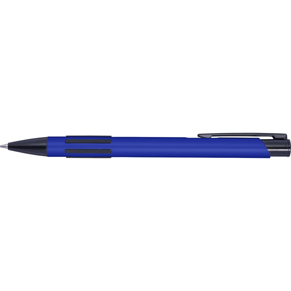 Golyóstoll lakkozott felülettel, nyomógombbal, kék tollbetéttel. A klipsz, a hegy és a gumis fogófelület színe illeszkedő fekete., alumínium, PVC, gumi Emblémázás: Gravírozás, Tamponnyomás