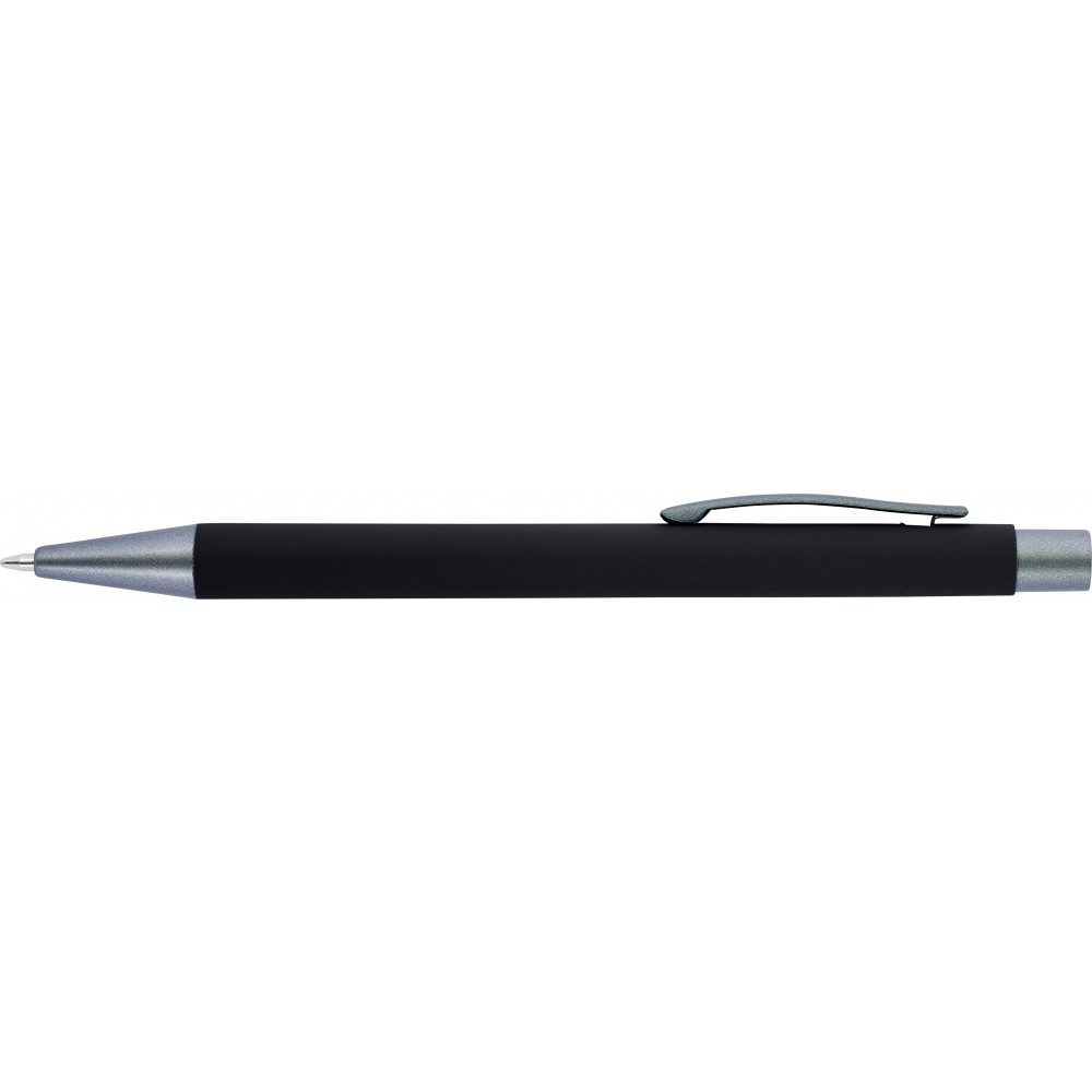 Golyóstoll gumis bevonattal, kék tollbetéttel. A hegy, klipsz és a nyomógomb egyforma sötétszürke színű. ABS, alumínium. Emblémázás: Gravírozás, UV nyomtatás