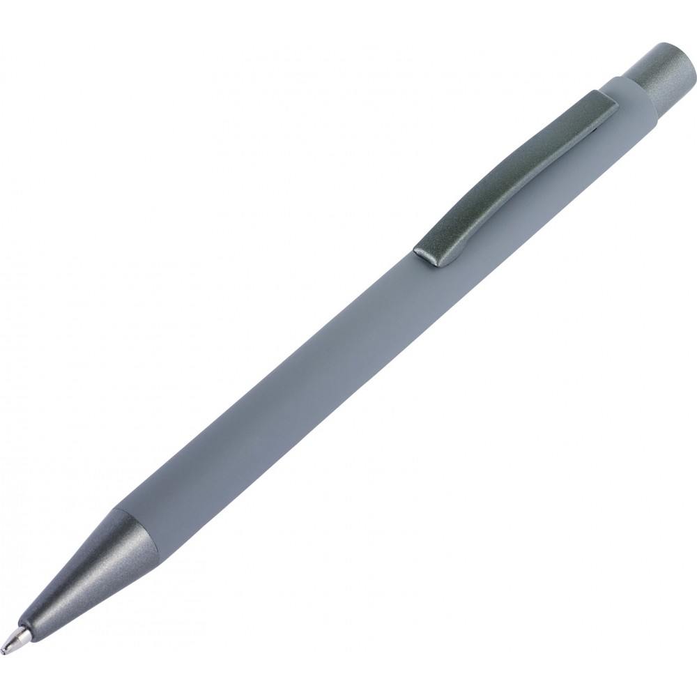 Golyóstoll gumis bevonattal, kék tollbetéttel. A hegy, klipsz és a nyomógomb egyforma sötétszürke színű. ABS, alumínium. Emblémázás: Gravírozás, UV nyomtatás