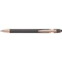 Golyóstoll gumis bevonattal, érintővel, kék tollbetéttel. ABS, PP műanyag, szilikon, vas. Emblémázás: UV nyomtatás