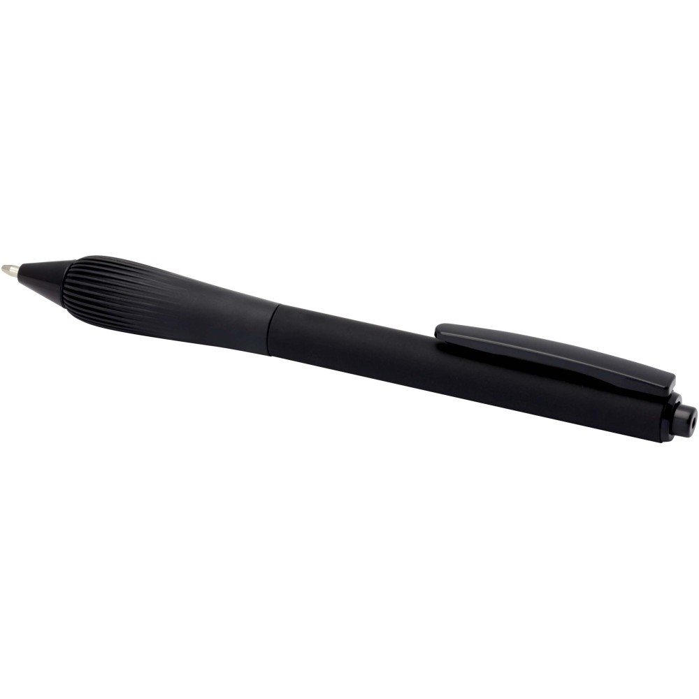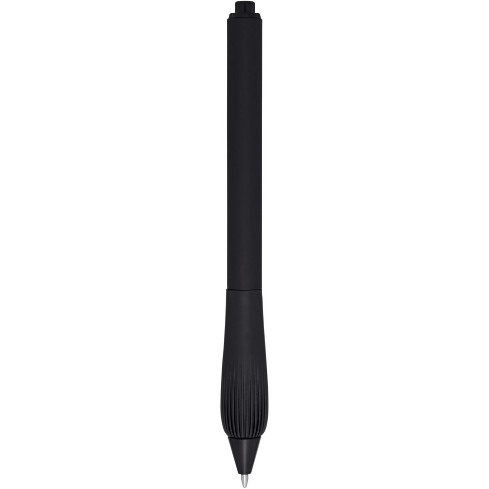 Újrahasznosított műanyag golyóstoll gumírozott tolltesttel és TPR anyagból készült fogórésszel. Fekete tollbetéttel. Írási hossz: 1000 méter. Hegyméret: 1,0 mm. Emblémázás: Tamponnyomás