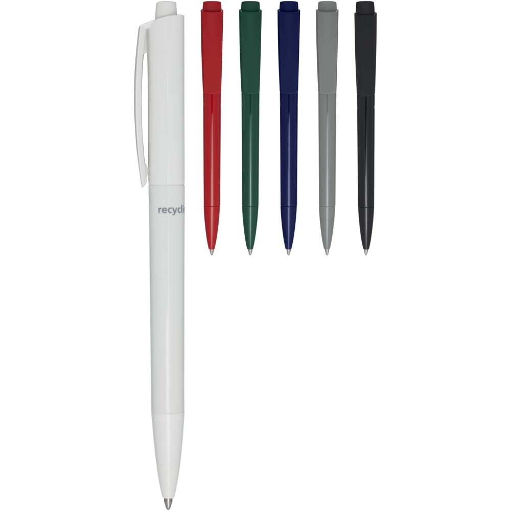 Golyóstoll, amelynek teste és klipsze újrahasznosított műanyagból, hegye pedig rozsdamentes acélból készült. Kék tollbetéttel. Íráshossz: 3000 méter. Hegyméret: 1,00 mm. Németországban készült. Emblémázás: Tamponnyomás