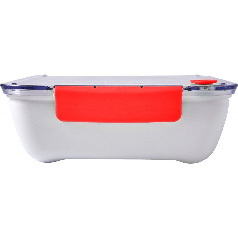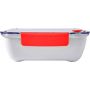 Ételdoboz, mely kenyér tárolására is kiválóan alkalmas. Átlátszó fedéllel, szilikon csatokkal, kivehető, háromszög alakú belső tárolóval, villával. 920 ml. BPA-mentes műanyag. Emblémázás: Tamponnyomás