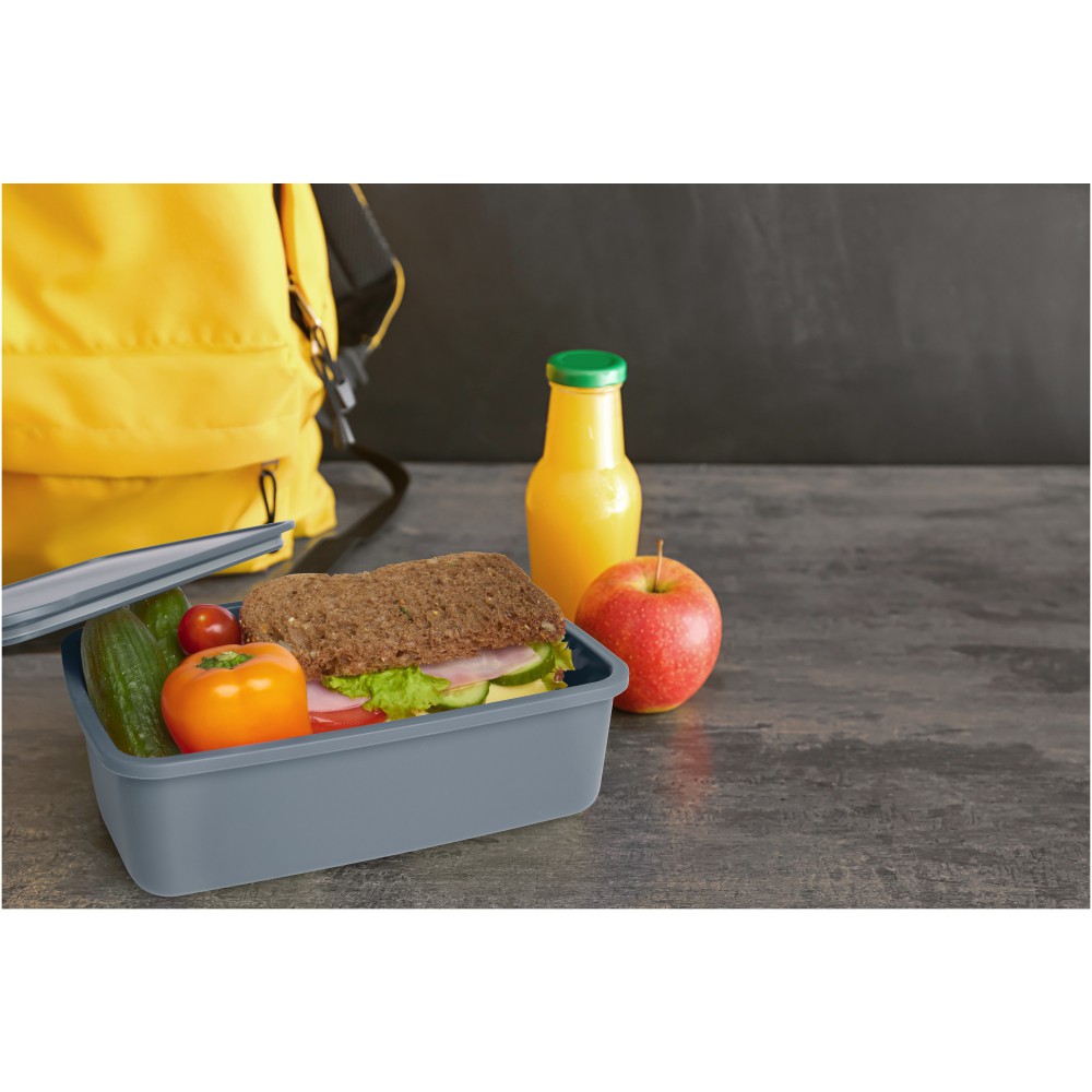 A 800 ml-es Dovi ebéddoboz 100%-ban újrahasznosított műanyagból készült, így fenntartható és trendi választás. Elasztikus szalaggal záródik, amely biztonságosan a helyén tartja a fedelet útközben. Emblémázás: UV nyomtatás