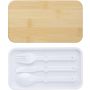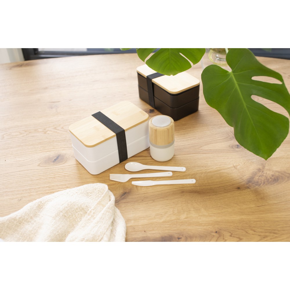 Kétrétegű uzsonnásdoboz több rekesszel (2 x 400 ml) és bambuszfedéllel. Tartalmazza az elválasztót és a műanyag evőeszközöket (kanál, villa és kés), valamint a rugalmas szalagot. PP. Emblémázás: Gravírozás, Tamponnyomás, UV nyomtatás