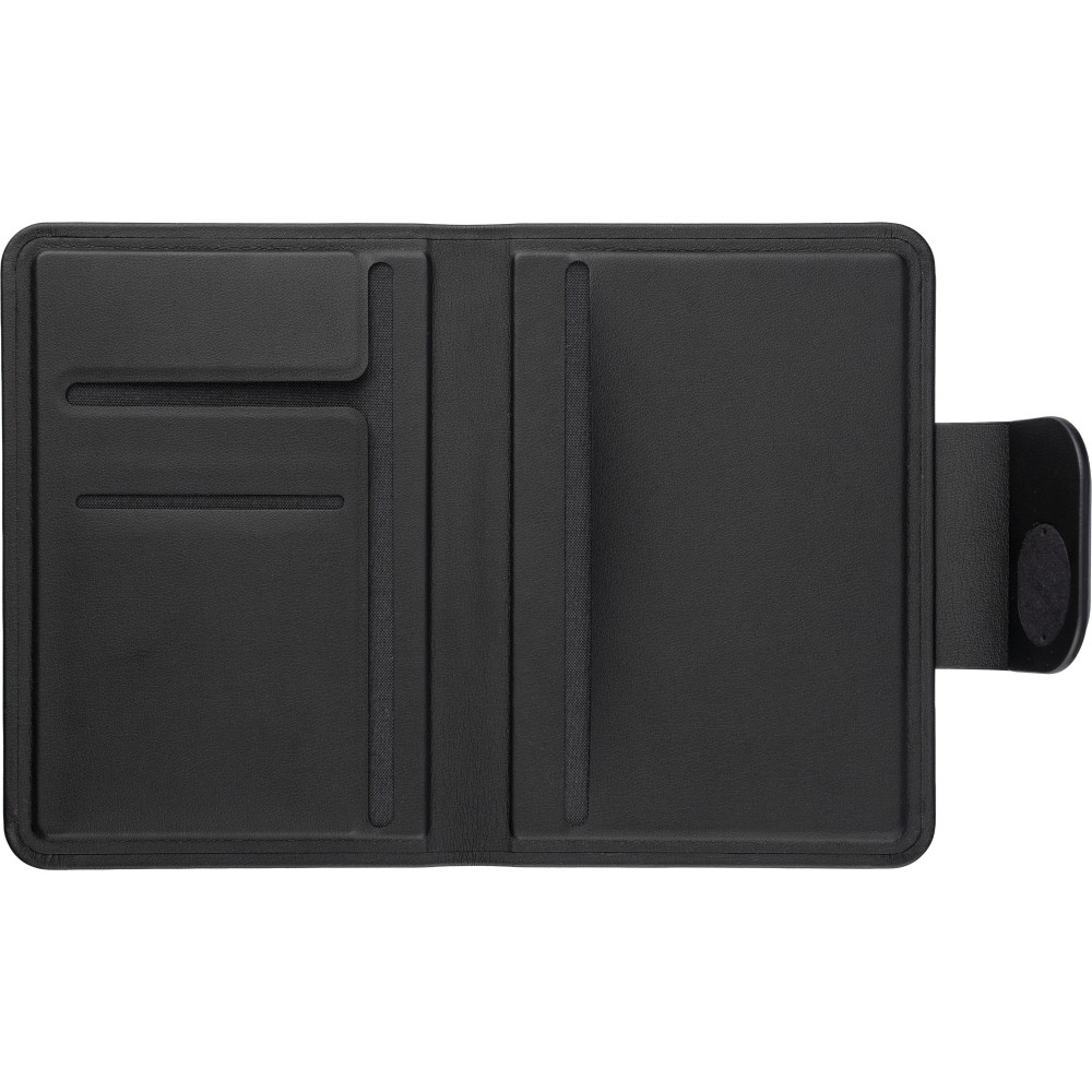 Újrahasznosított PU anyagból készült keményfedeles útlevéltartó mágneses záródással és a zárófülbe ágyazott, beépített Apple FindMy nyomkövetővel. Három belső tárolórésszel az iratok és kártyák rendszerezéséért. Csomagolása kraftpapír doboz. Emblémázás: Gravírozás